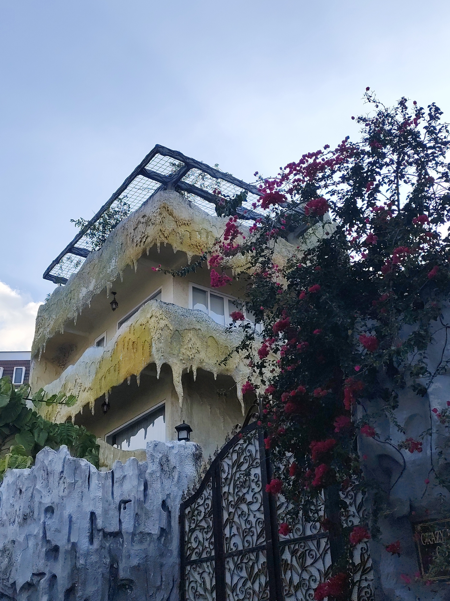 The image depicts the Crazy House in Da Lat, Vietnam, viewed from a low angle. The building features unconventional architecture with a facade designed to resemble a tree trunk or cave. It has multiplβ¦read more
