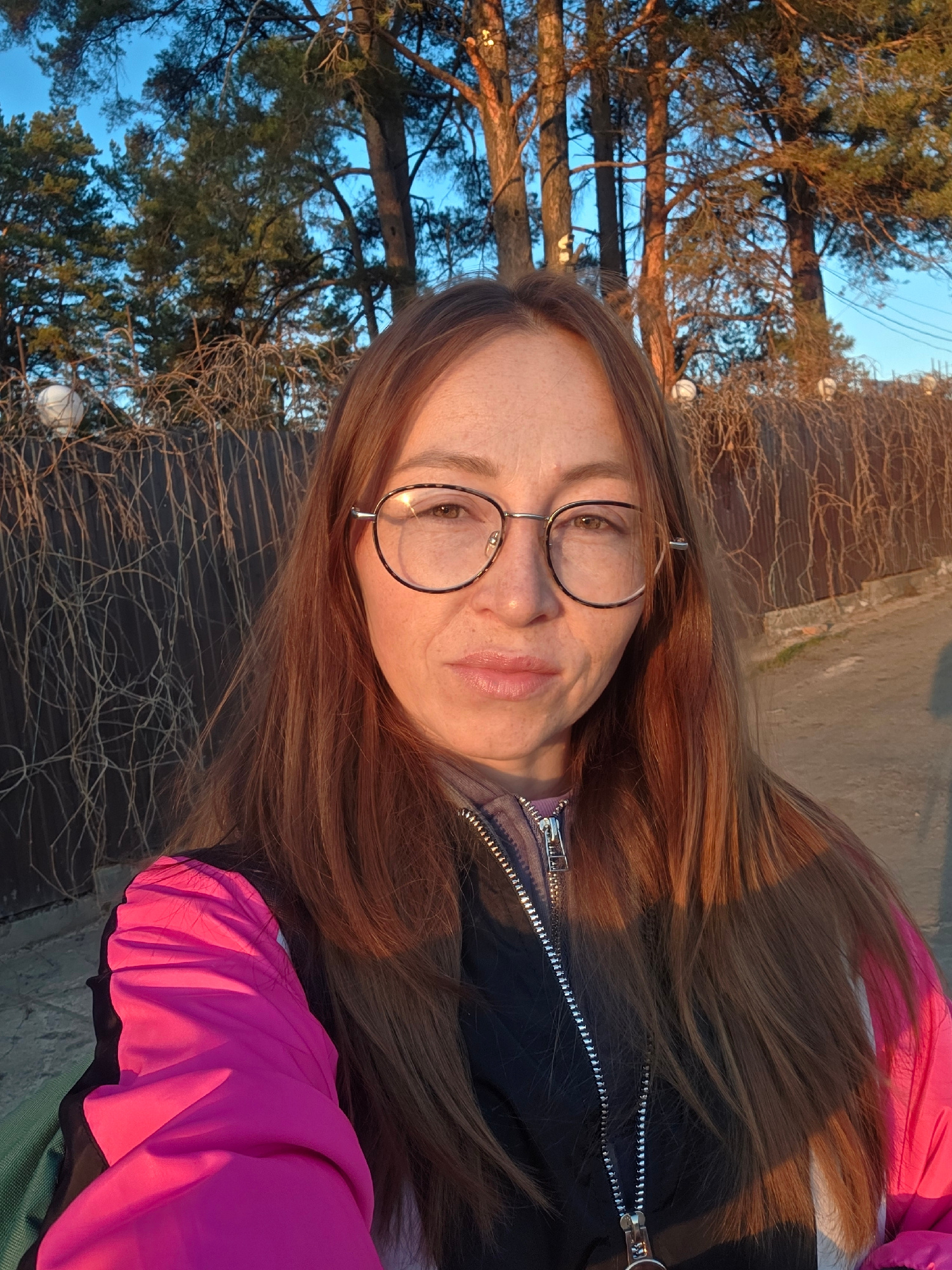 The image is a portrait of a woman with long, auburn hair and round glasses. She is wearing a black jacket with a silver zipper and a bright pink outer layer. The background consists of bare tree bran…read more