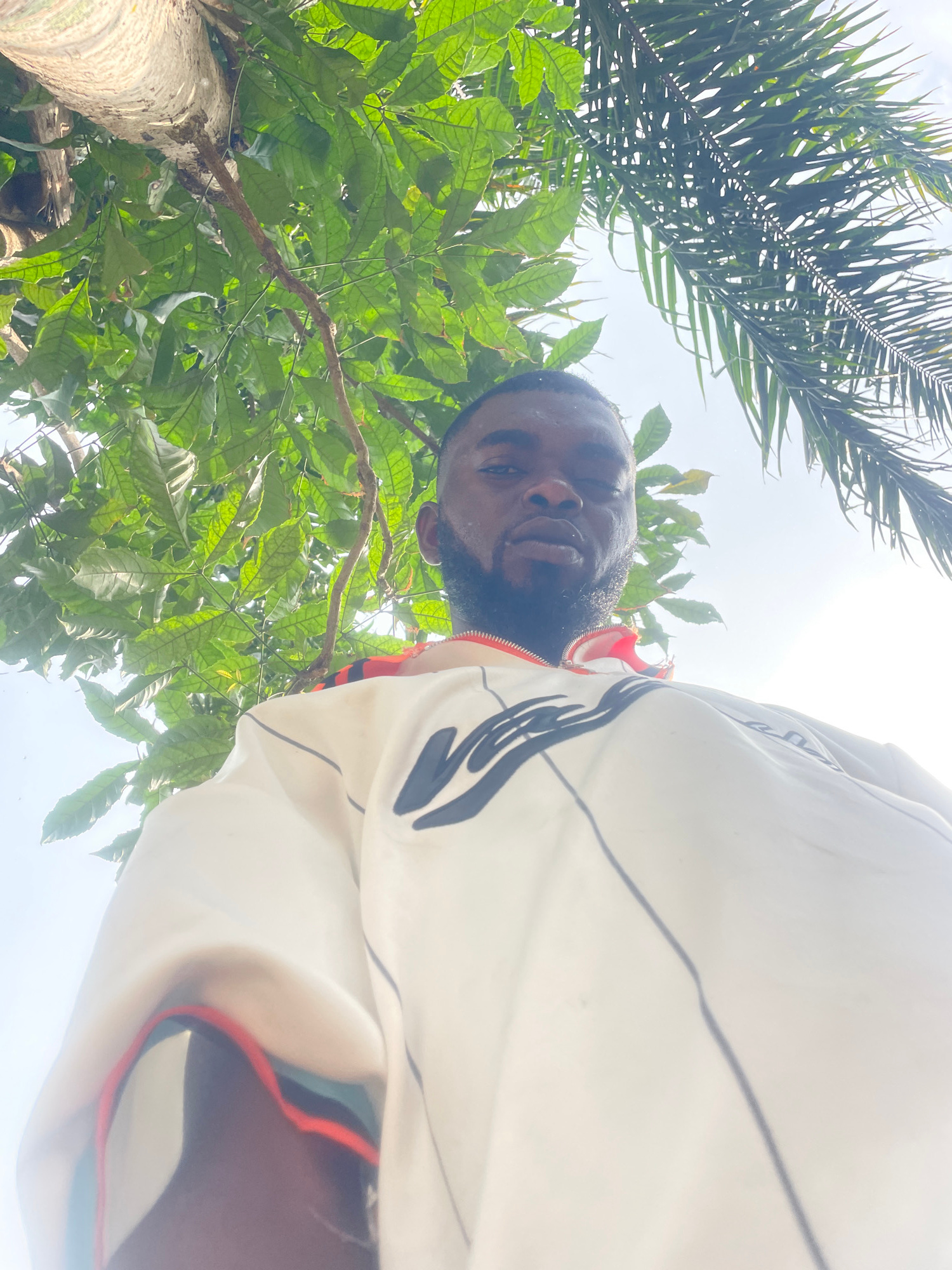 A low-angle shot shows a man with dark skin and a beard standing under trees with dense green foliage. The man is wearing a white shirt with black and red details. Above the trees, a bright sky is vis…read more