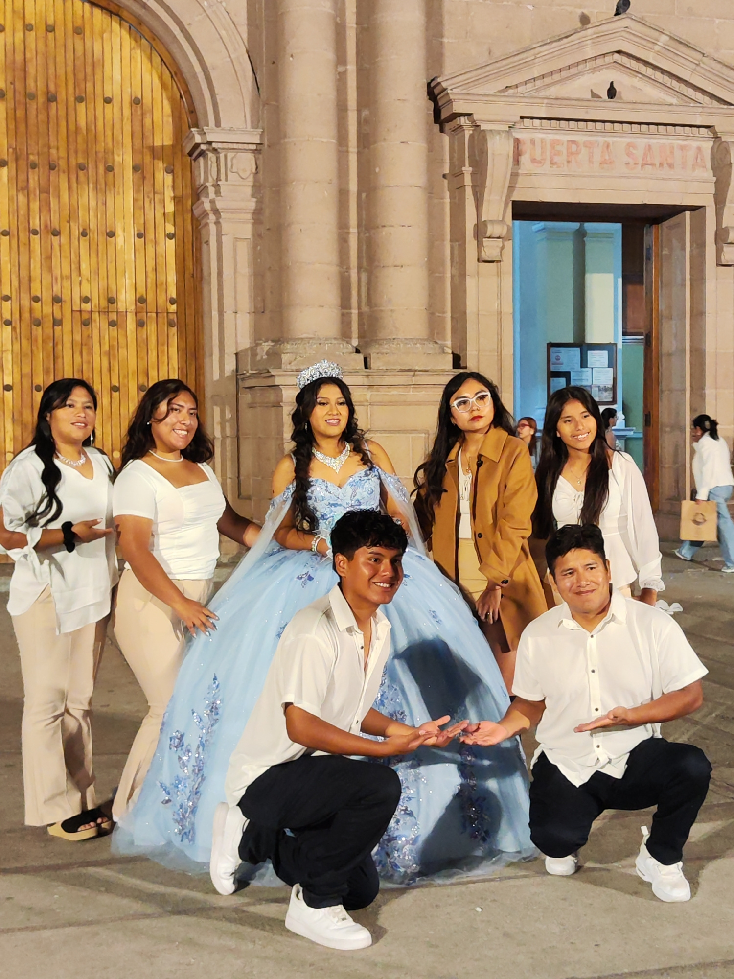 The image depicts a group of people posing for a photograph in front of a building with a large wooden door and a stone facade. The architecture suggests a historical or religious building. In the upp…read more