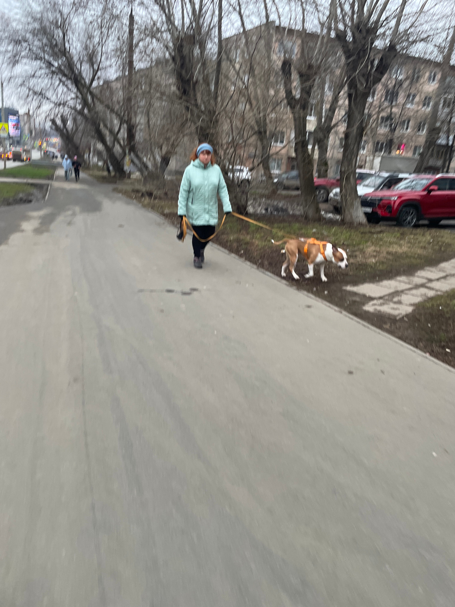 The image shows a woman walking a brown and white dog on a leash on a concrete sidewalk. The woman is wearing a light green jacket and a blue hat. The dog is wearing a brown harness. The background in…read more
