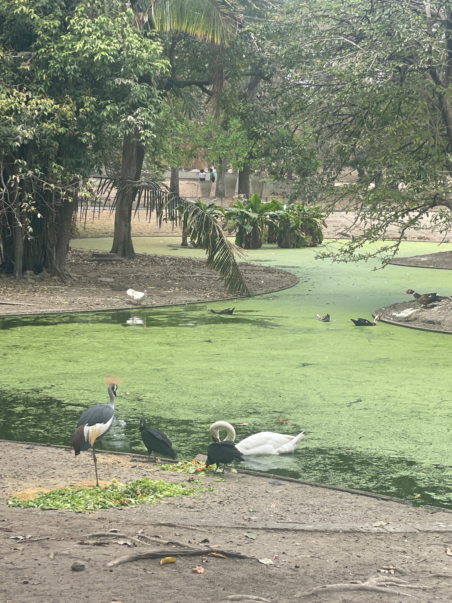 This image depicts a section of a zoo or aviary located in Caracas, Venezuela. The foreground shows a dirt bank bordering a body of water extensively covered in green aquatic vegetation. A Grey Crowneβ¦read more