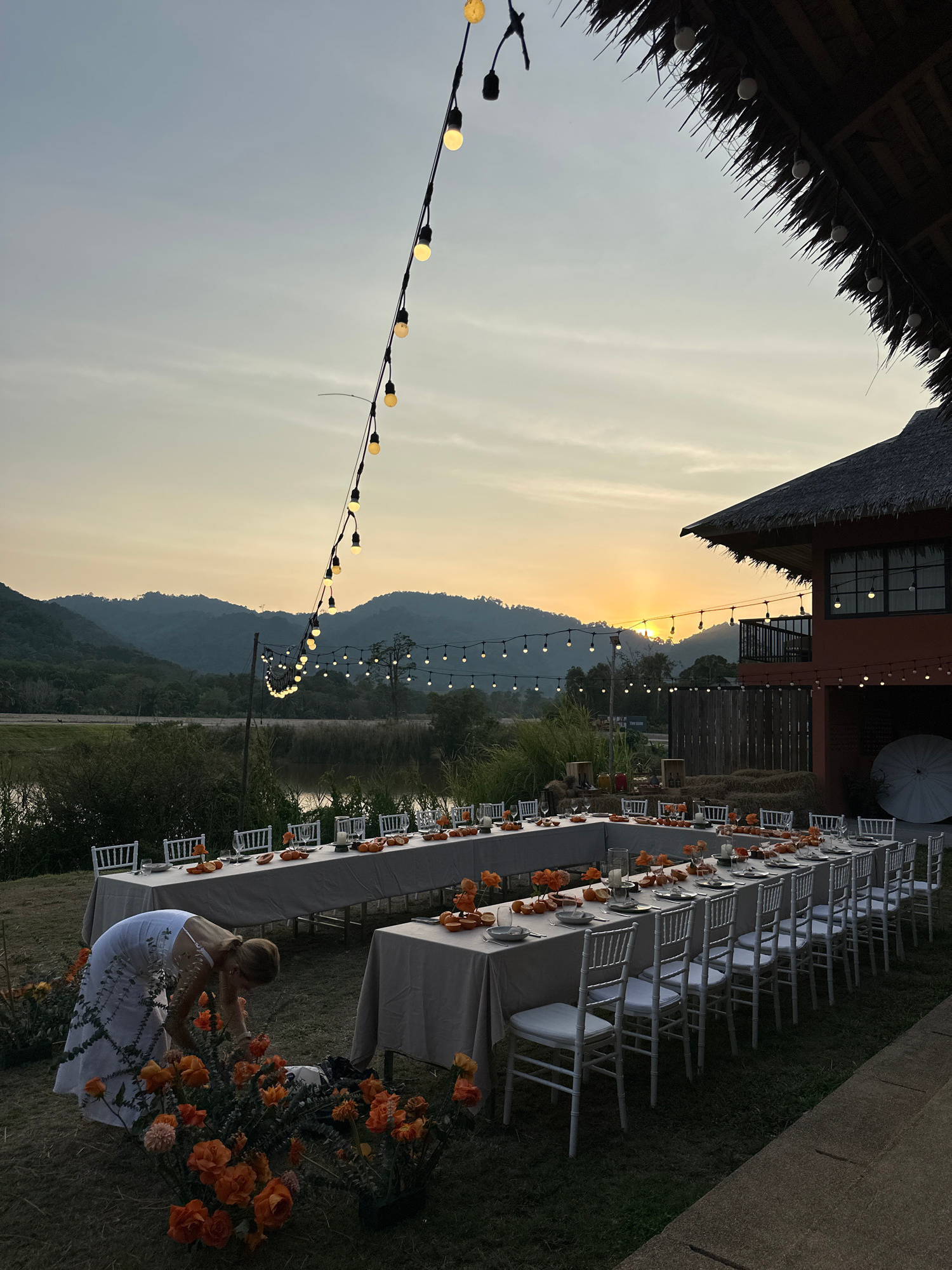 The image displays an outdoor event setup at sunset in Si Sunthon, Thailand. A U-shaped dining table arrangement, covered with light grey tablecloths and lined with white Chiavari chairs, occupies a g…read more