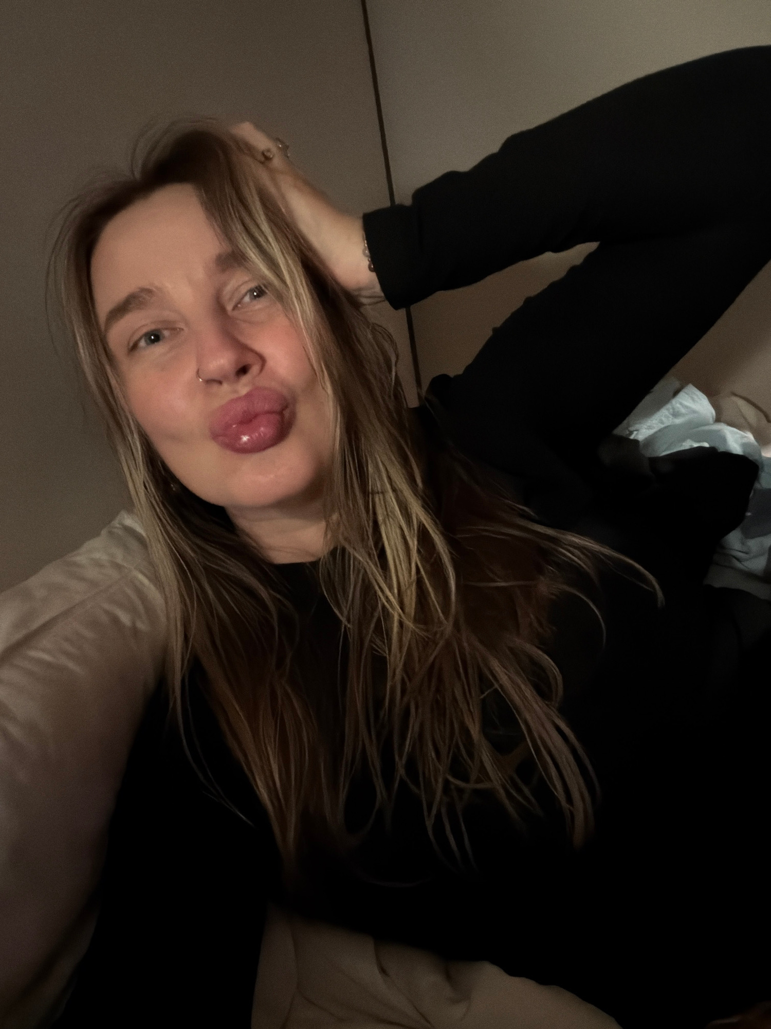 A woman with long blonde and brown hair is lying down. She is wearing a black long-sleeved shirt and has a nose ring. Her head rests on a white pillow, and her hair is spread around her. The backgroun…read more