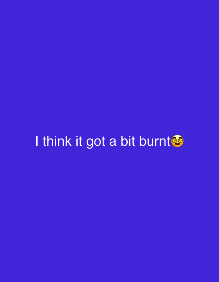 The image consists of a solid dark blue background. White text is centered and reads "I think it got a bit burnt" followed by a nervous face emoji with glasses. The text is simple and direct, implying…read more