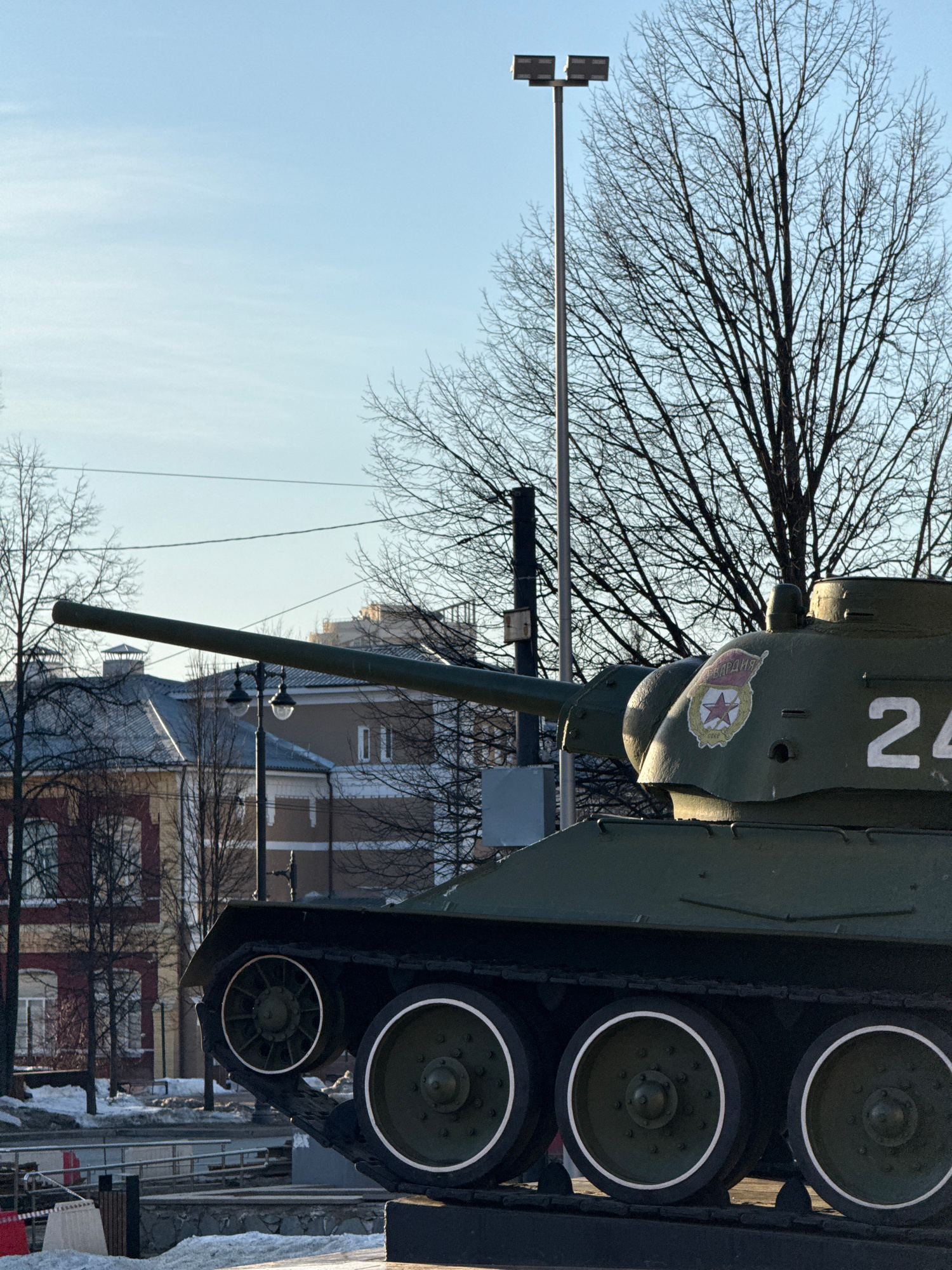 The image displays a green Soviet-era T-34 tank monument, observed from its right side, with the main gun barrel aimed leftward. The tank's turret features a circular red and yellow emblem containing…read more