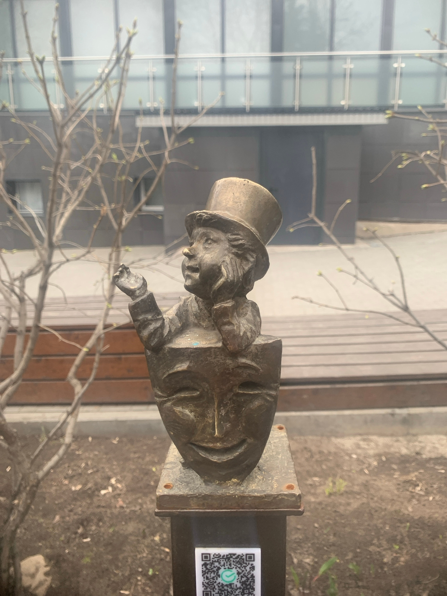 The image depicts a bronze bust of a person wearing a top hat. The bust is mounted on a dark post with a square base. A QR code is affixed to the side of the post. Bare branches with emerging buds are…read more