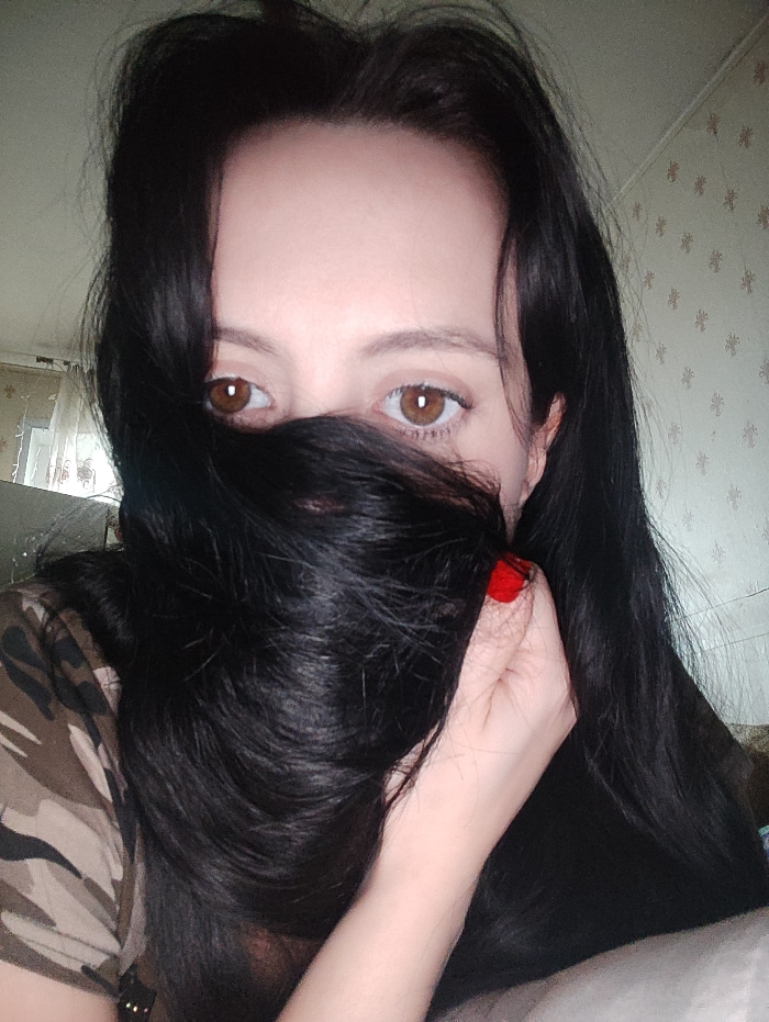 An individual, identified as female, is depicted in a close-up, chest-up shot within an indoor setting in Donetsk, Ukraine. The subject has dark, long hair that is intentionally pulled across the lowe…read more