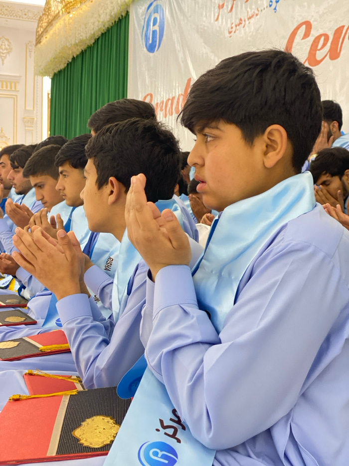 A group of young men in light blue uniforms and sashes stand in a row, their hands clasped together in prayer or reverence. They face forward, heads slightly bowed. Behind them, a banner with Arabic s…read more