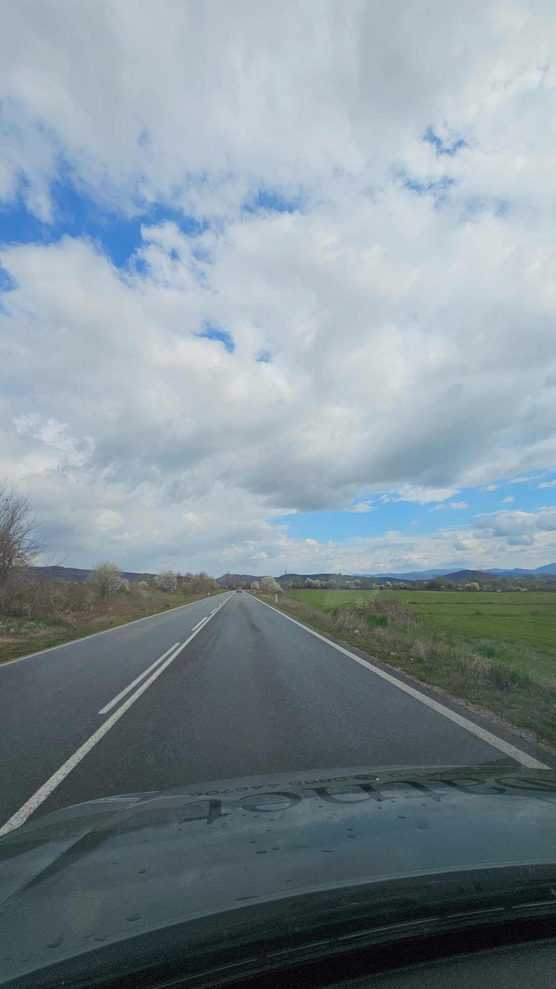 The image shows a view from a moving vehicle, likely a car or truck, driving on a paved road in Vasil Levski, Bulgaria. The road has a double white line marking the center. To the right, there is a fi…read more
