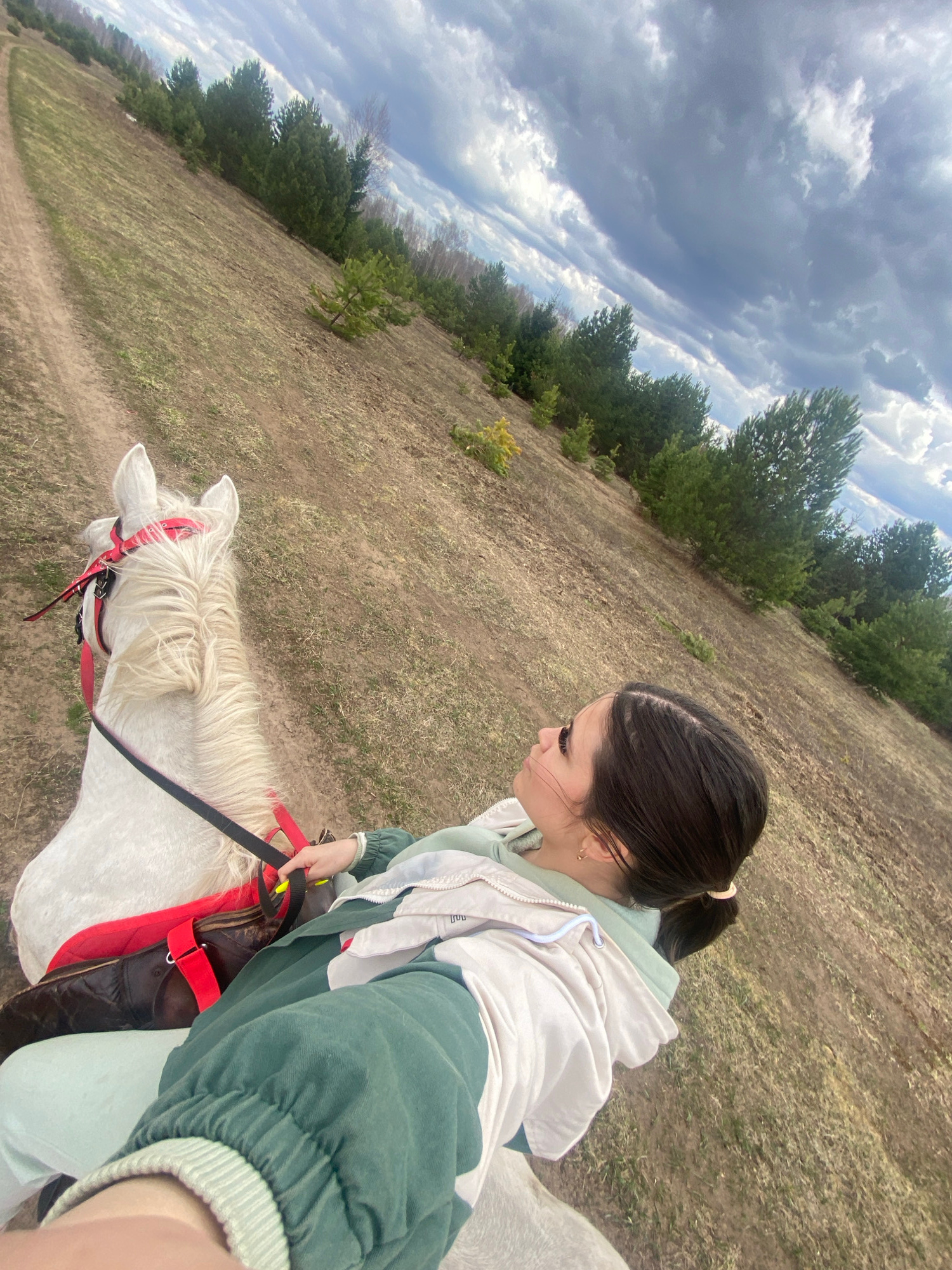 A woman is riding a white horse in a field. The field is dry and grassy. There are trees in the background. The sky is cloudy. The location is Zhigalki, Russia.