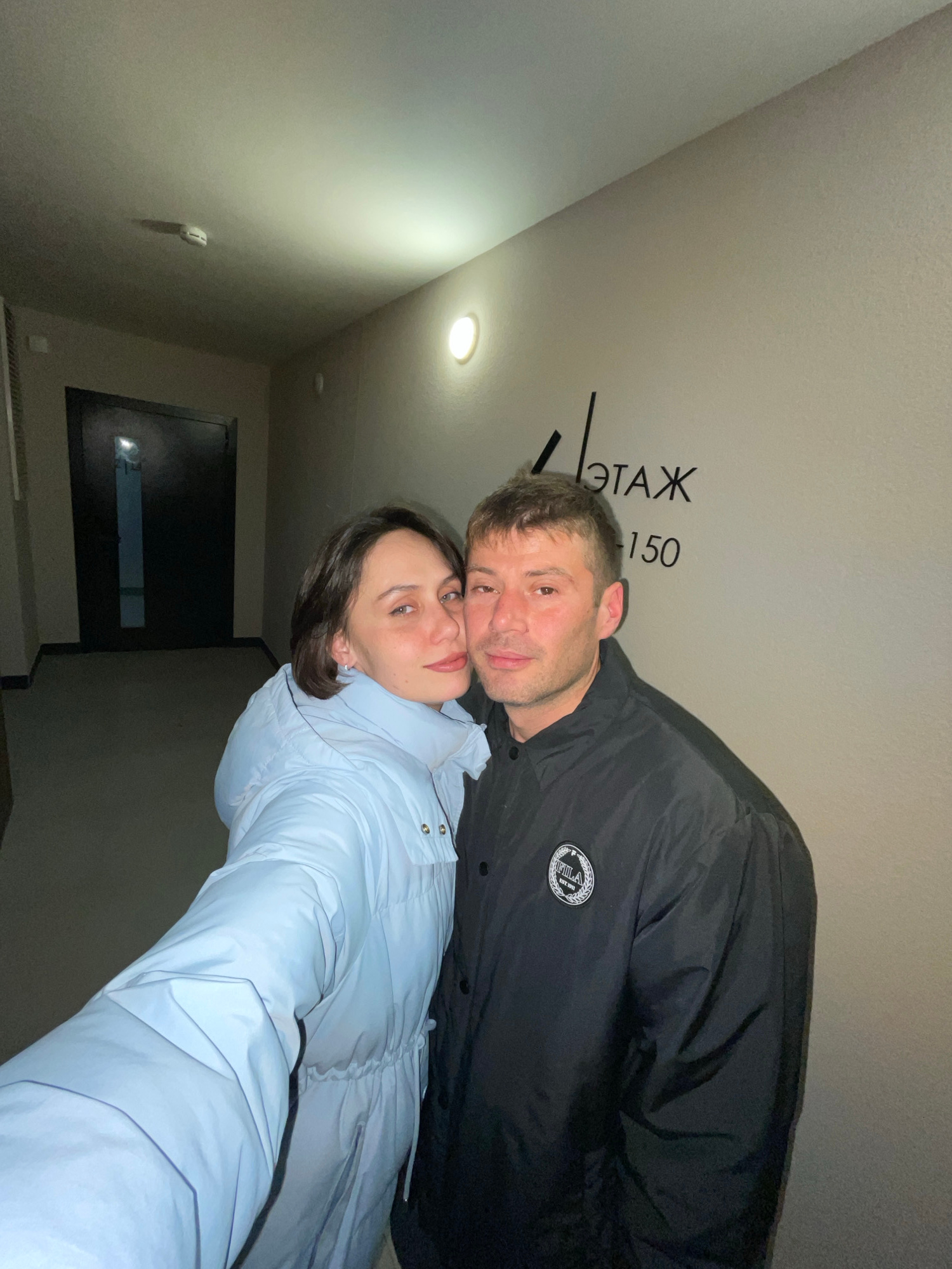 Two individuals, a man and a woman, are posing closely together in what appears to be an indoor setting. The man is wearing a black jacket with a round logo, and the woman is wearing a light blue puff…read more