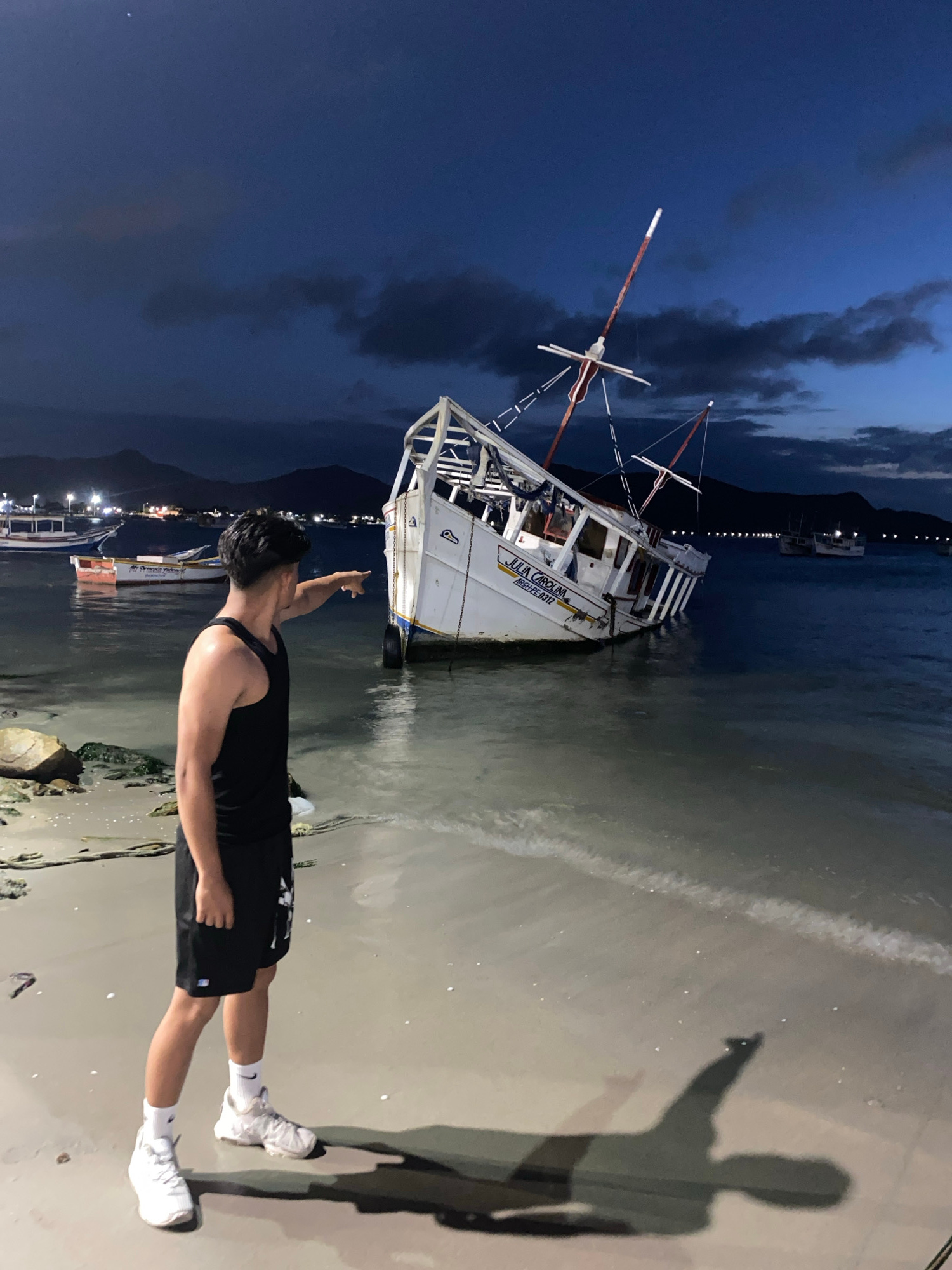 A man in black shorts and a black tank top stands on a sandy beach, pointing towards a white ship beached on the shoreline in Juan Griego, Venezuela. The ship, named "Julia Carolina" is listing slight…read more