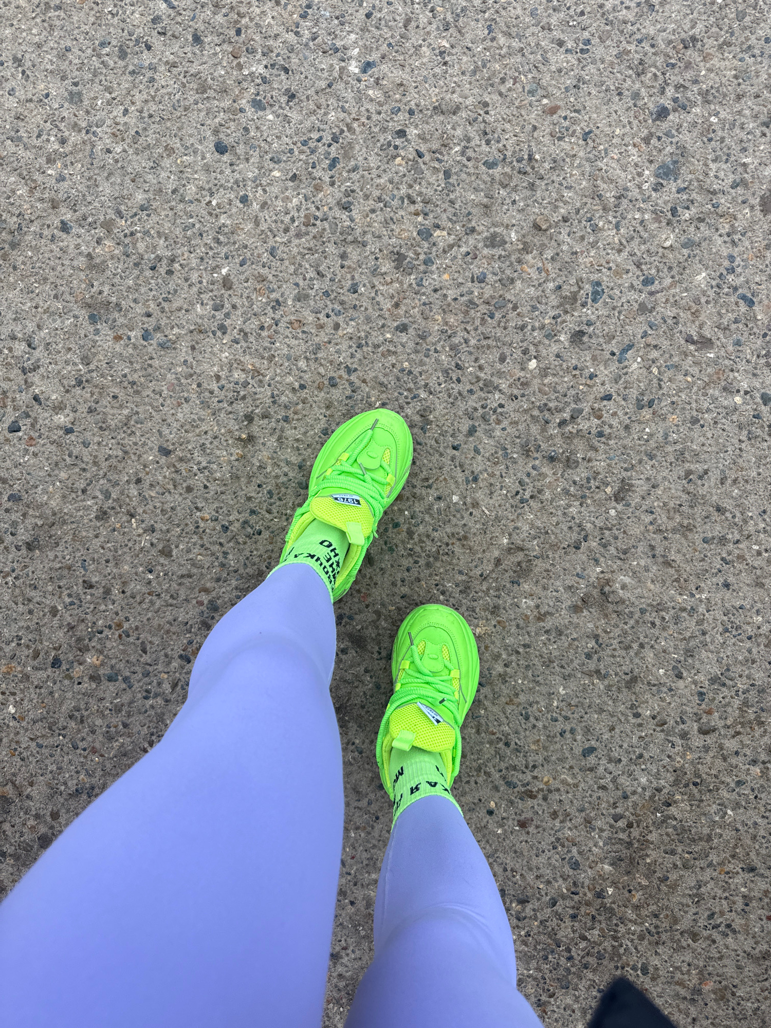 A top-down shot shows a person standing on a gray concrete surface. The person is wearing light purple leggings and neon green athletic shoes with matching neon green socks. The concrete surface is sp…read more