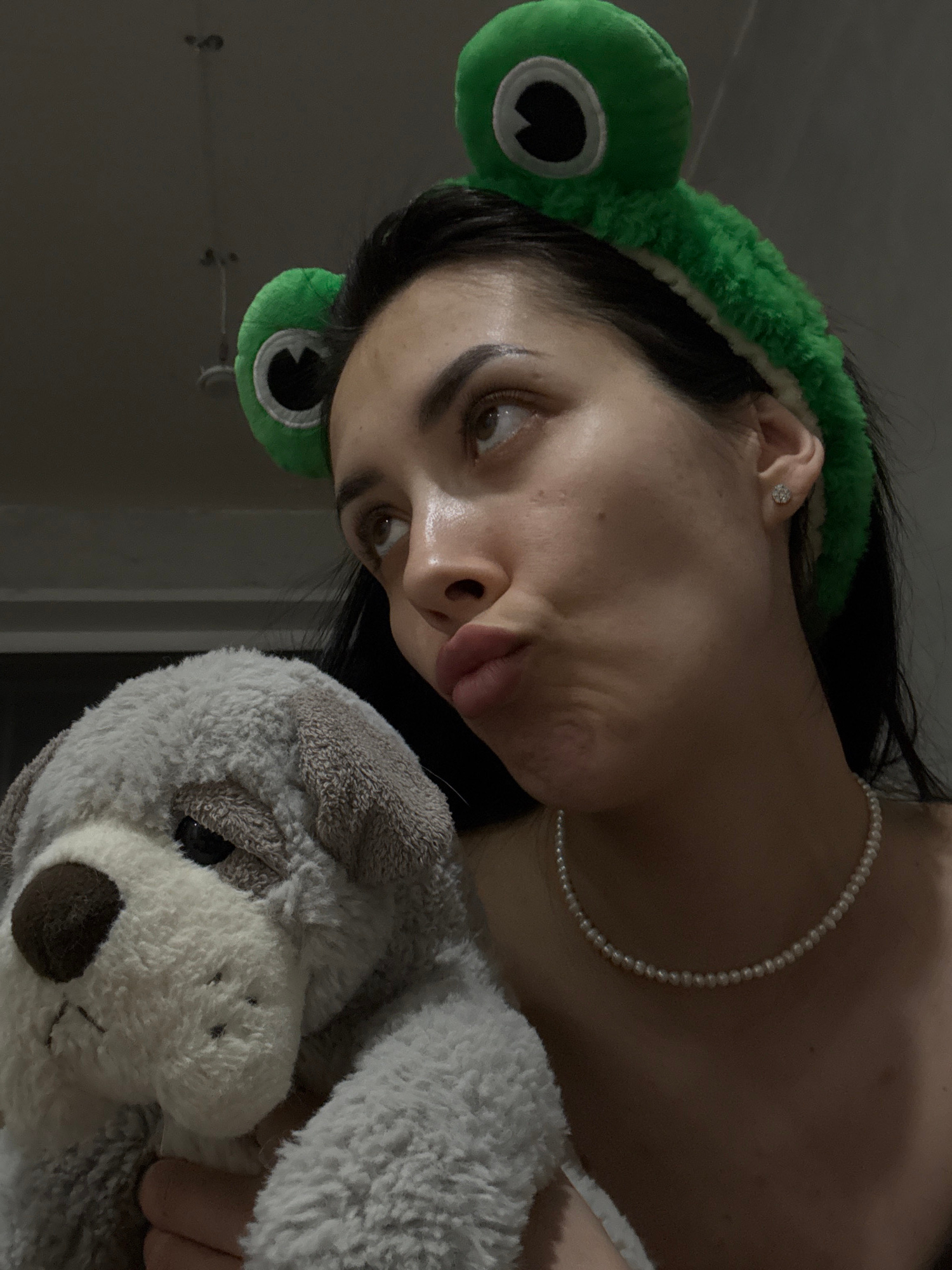 A person is depicted in a close-up, angled view, holding a plush, gray and white stuffed animal. The person is wearing a green, frog-themed headband and a pearl necklace. A small earring is visible in…read more