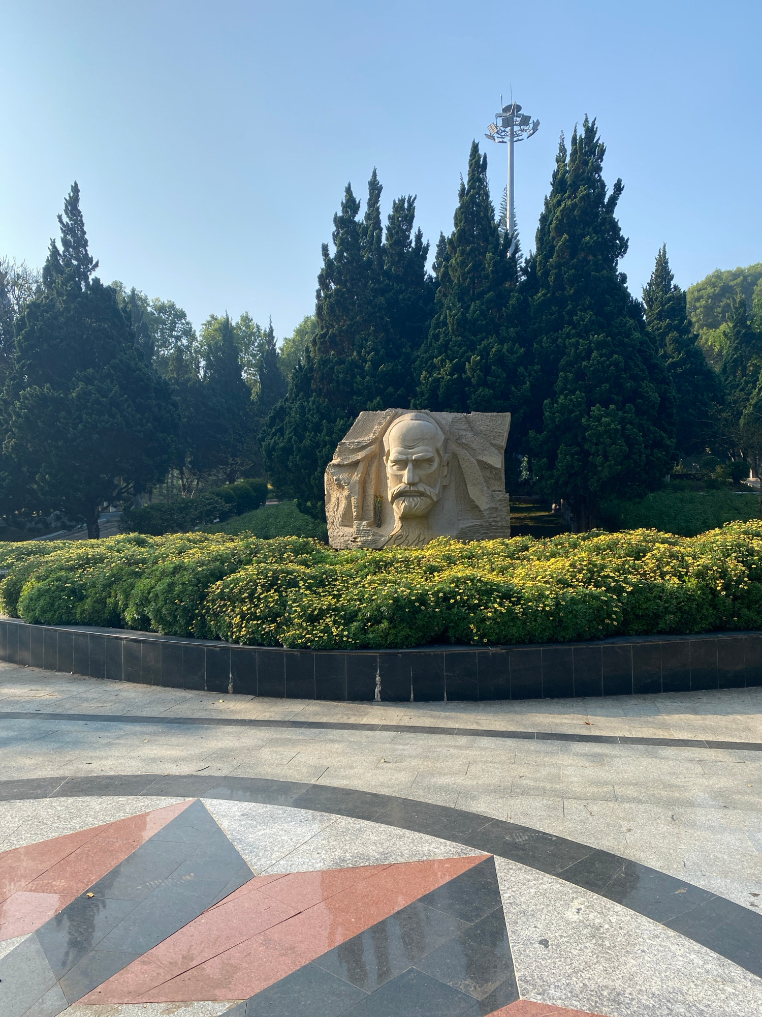 The image shows a stone bust monument of Dr. Alexandre Yersin in Da Lat, Vietnam. The bust, carved in light-colored stone, is set within a lush, green landscape, bordered by flowering shrubs. Tall eve…read more