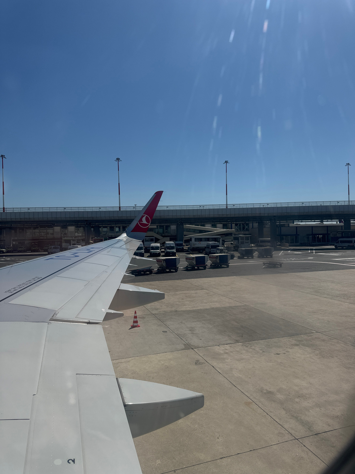 A view from inside an airplane at Fiumicino Airport in Fiumicino, Italy. The plane wing is visible with a Turkish Airlines logo on the red vertical stabilizer. The aircraft is on the ground beside a t…read more