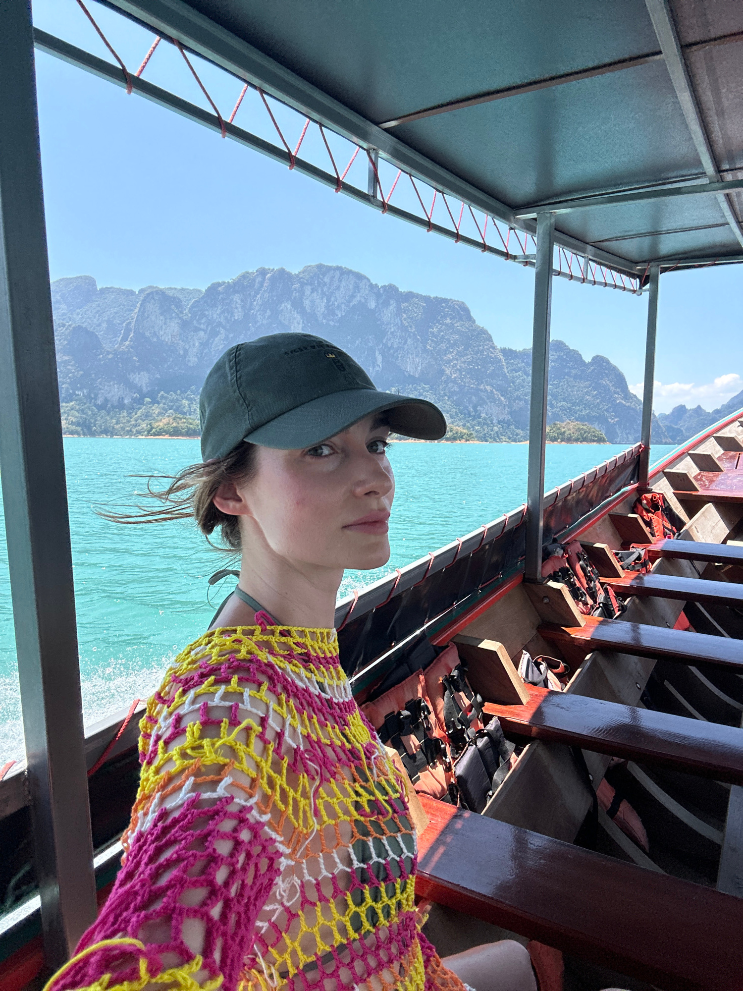 A person wearing a gray baseball cap and a colorful crocheted top is on a longtail boat in Ban Chiao Lan, Thailand. The turquoise water is visible on one side of the boat, with large, green mountains…read more