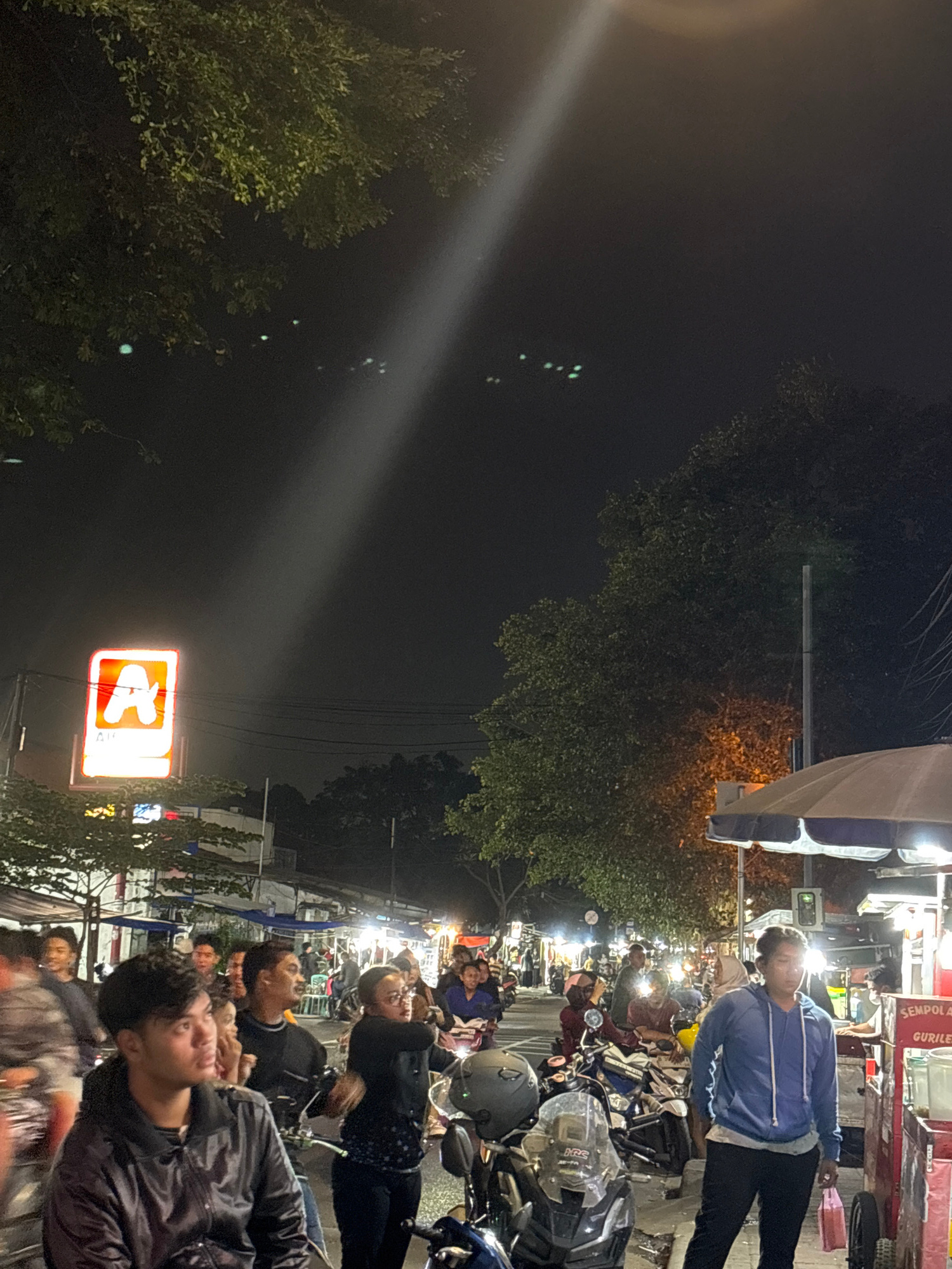 The image depicts a lively street scene at night in North Jakarta, Indonesia. Several people are gathered on the side of the road, some riding motorbikes, while others are standing and conversing. Man…read more