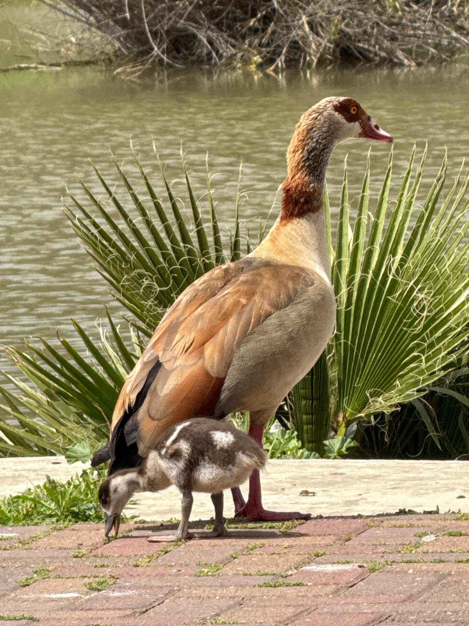 An Egyptian goose stands on a concrete and brick path, with a gosling nearby. The path is next to a body of water, possibly a river or pond, with sparse vegetation on the opposite bank. Behind the goo…read more