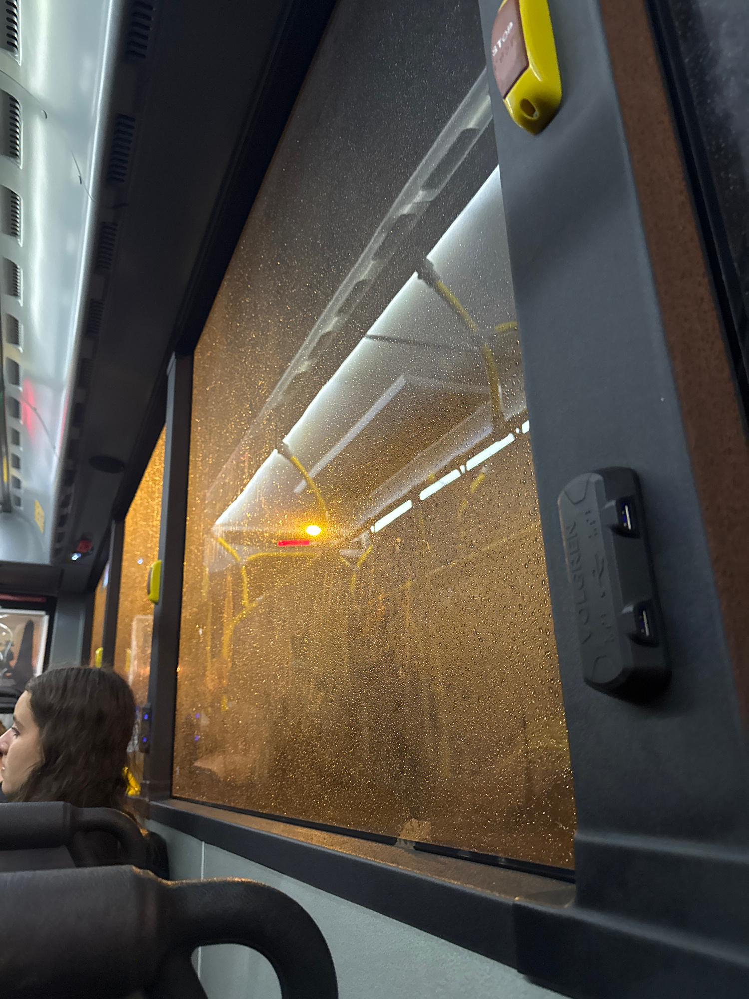 The image is taken from inside a public transport vehicle, likely a bus. The view is directed upwards towards the ceiling, which features a transparent panel speckled with moisture droplets. Above the…read more