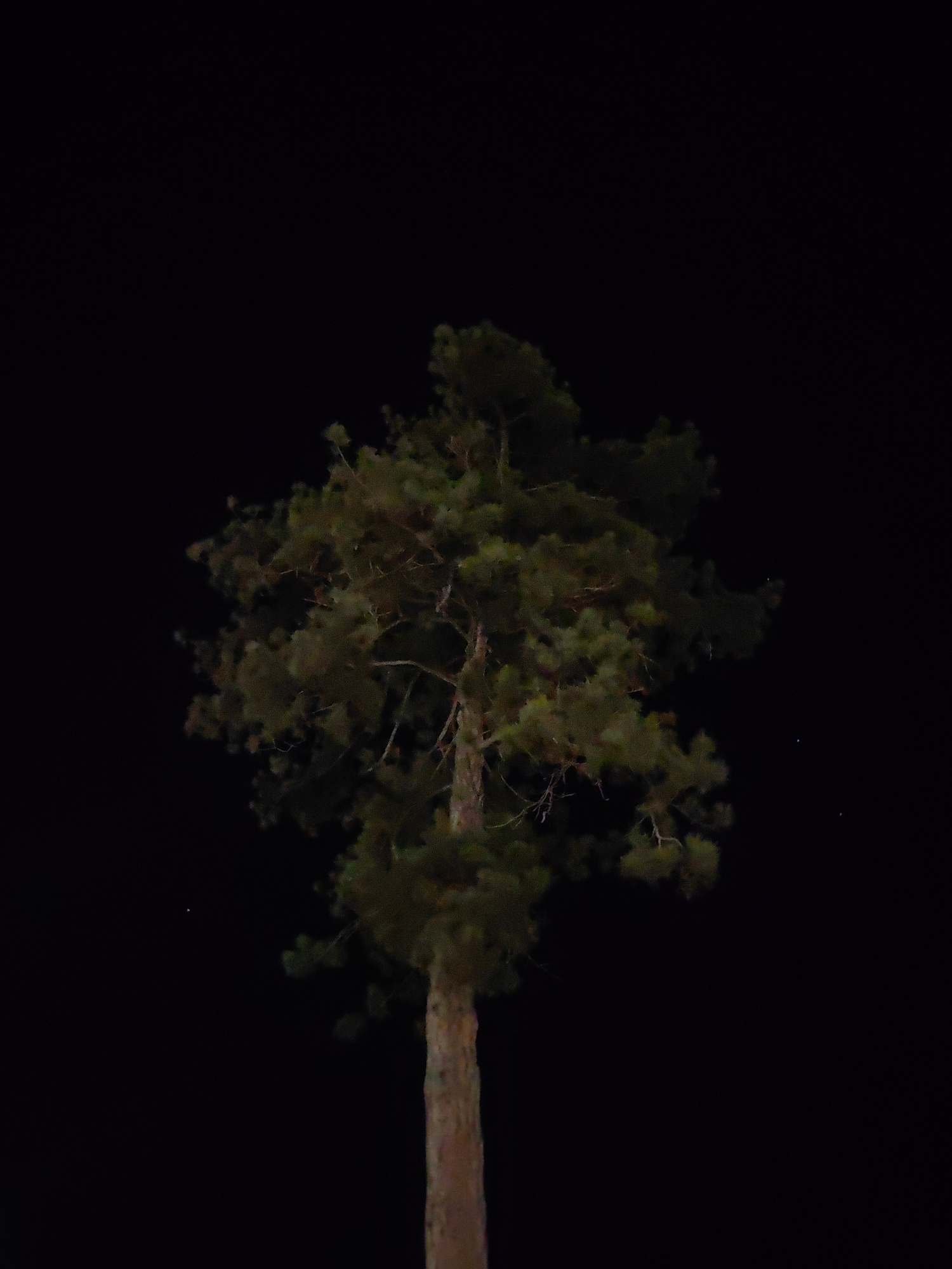 A lone tree stands in the center of a nighttime scene. The tree, likely a pine, has a visible trunk and a dense canopy of dark green needles. The background is completely black, suggesting darkness. T…read more