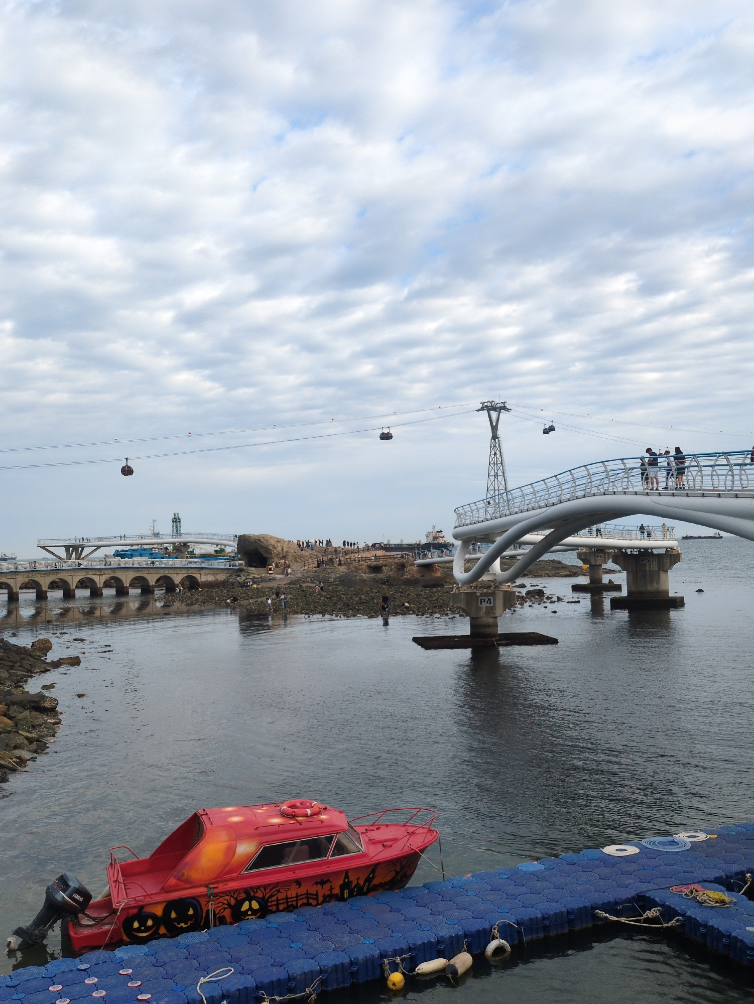 The image captures the Songdo Skywalk and Songdo Beach in Busan, South Korea. The Skywalk is visible, supported by pillars in the water, with people walking on it. A cable car system is also present,…read more