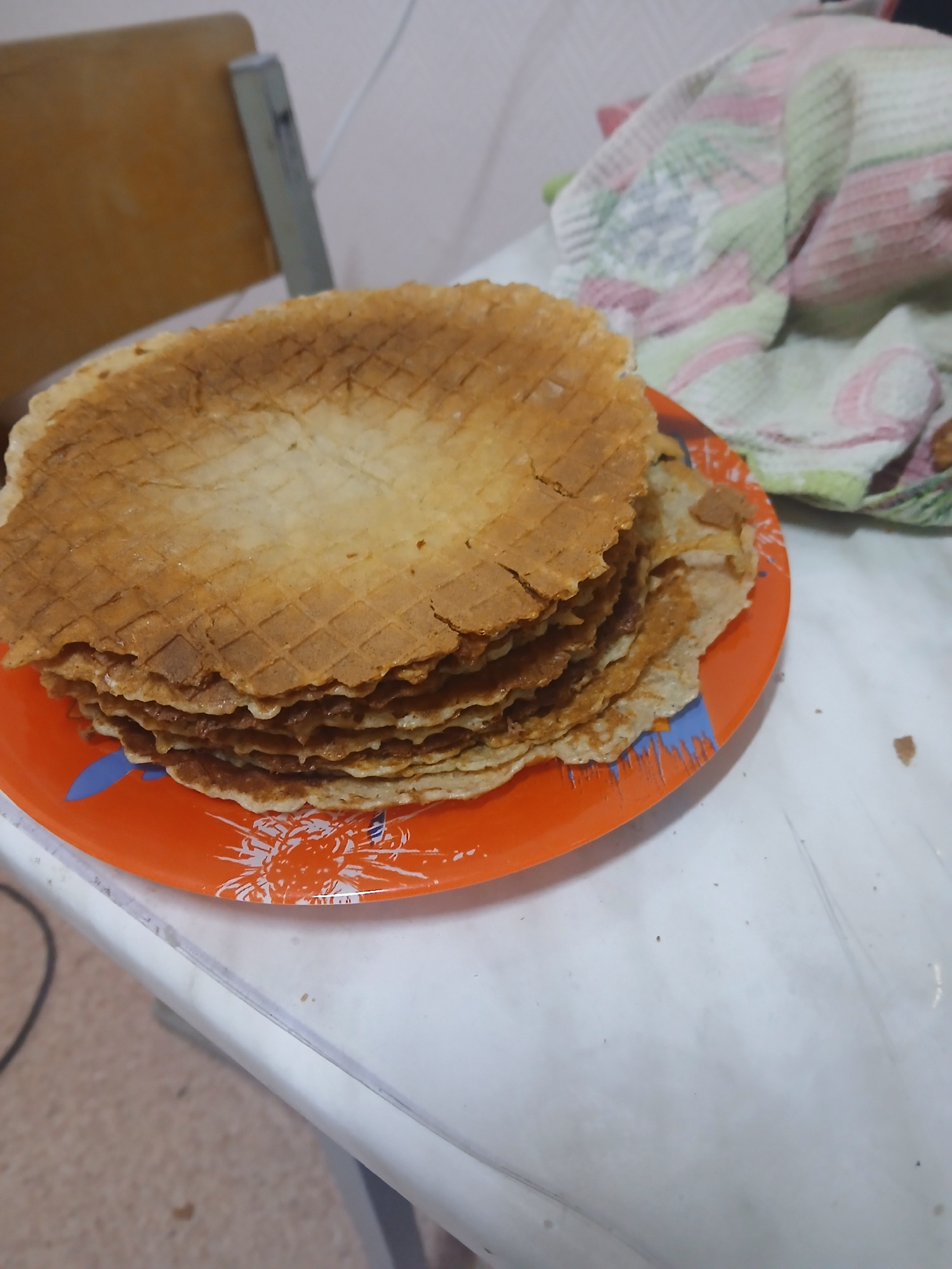 The scene shows a stack of waffle cookies on an orange plate with a white floral and blue flame-like design around the rim. The plate rests on a white, potentially plastic, table or surface. To the le…read more