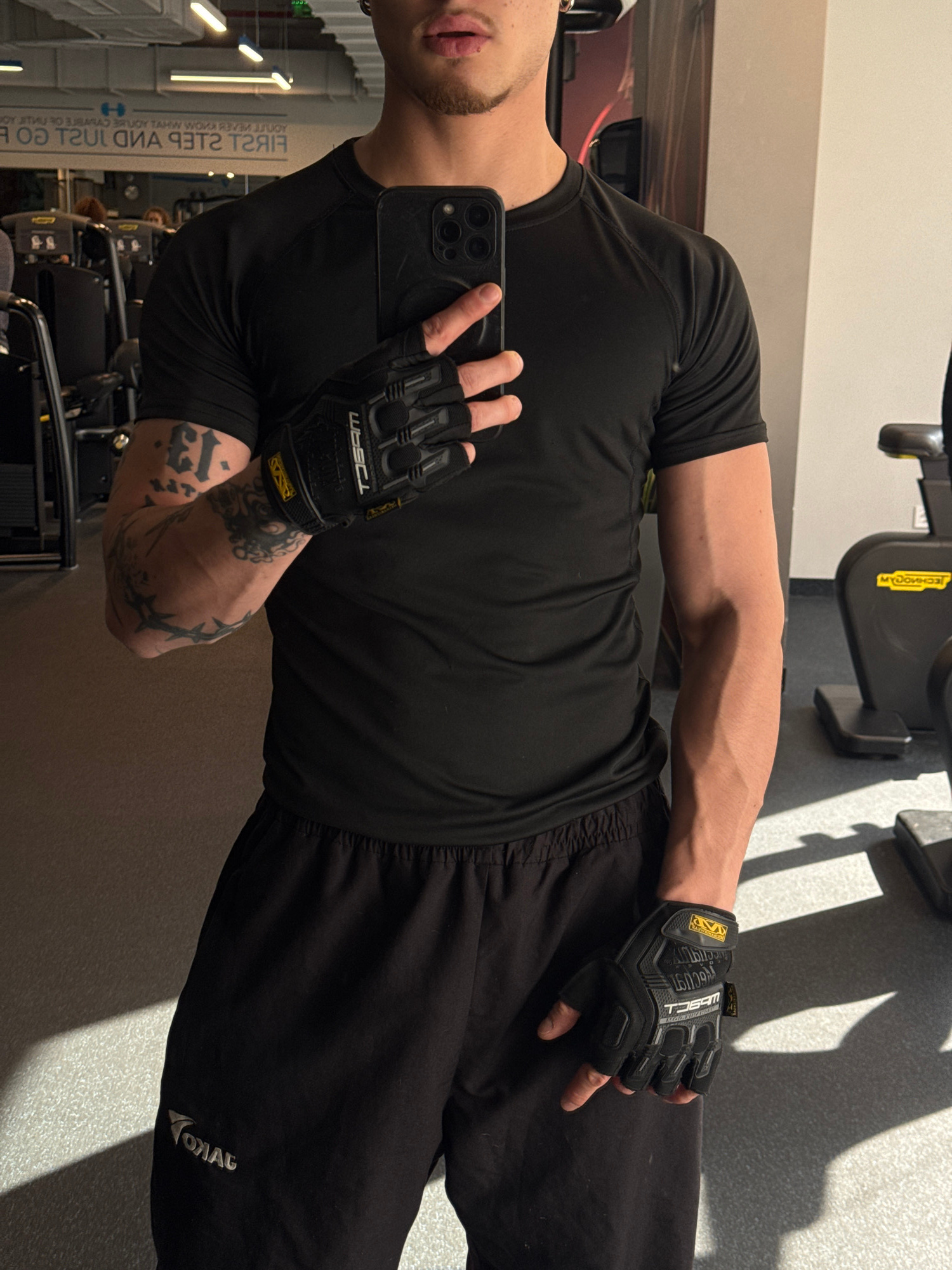 A male individual captures a mirror selfie inside a gym located in Sofia, Bulgaria. The subject is wearing a black short-sleeved athletic shirt, black athletic shorts with a grey "VOYAG" logo (reverseβ¦read more
