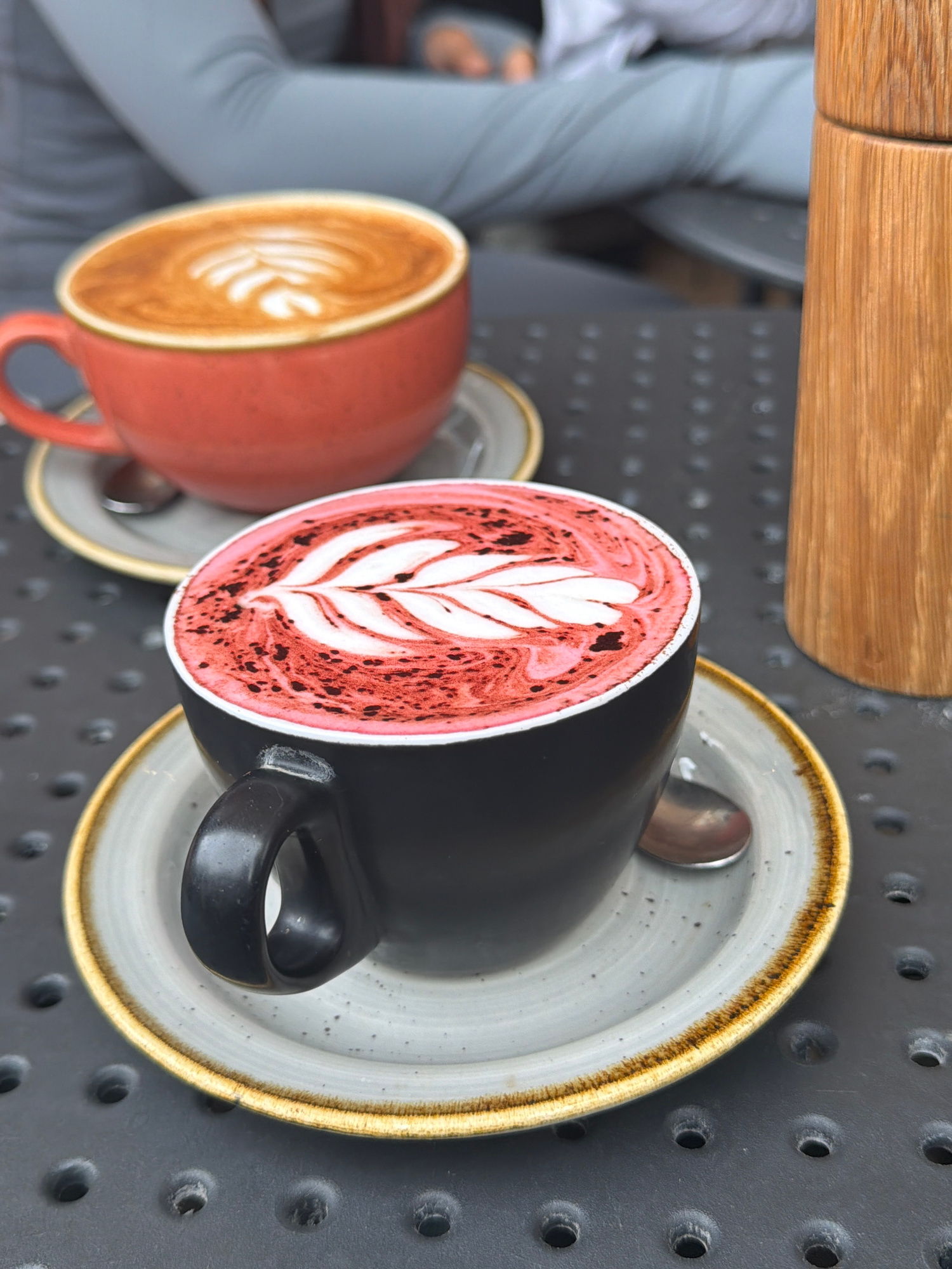 The image shows two cups of latte art coffee on a grey, perforated metal table. One cup is black with reddish-pink latte art resembling a leaf, and the other is reddish-orange with brown latte art. Bo…read more