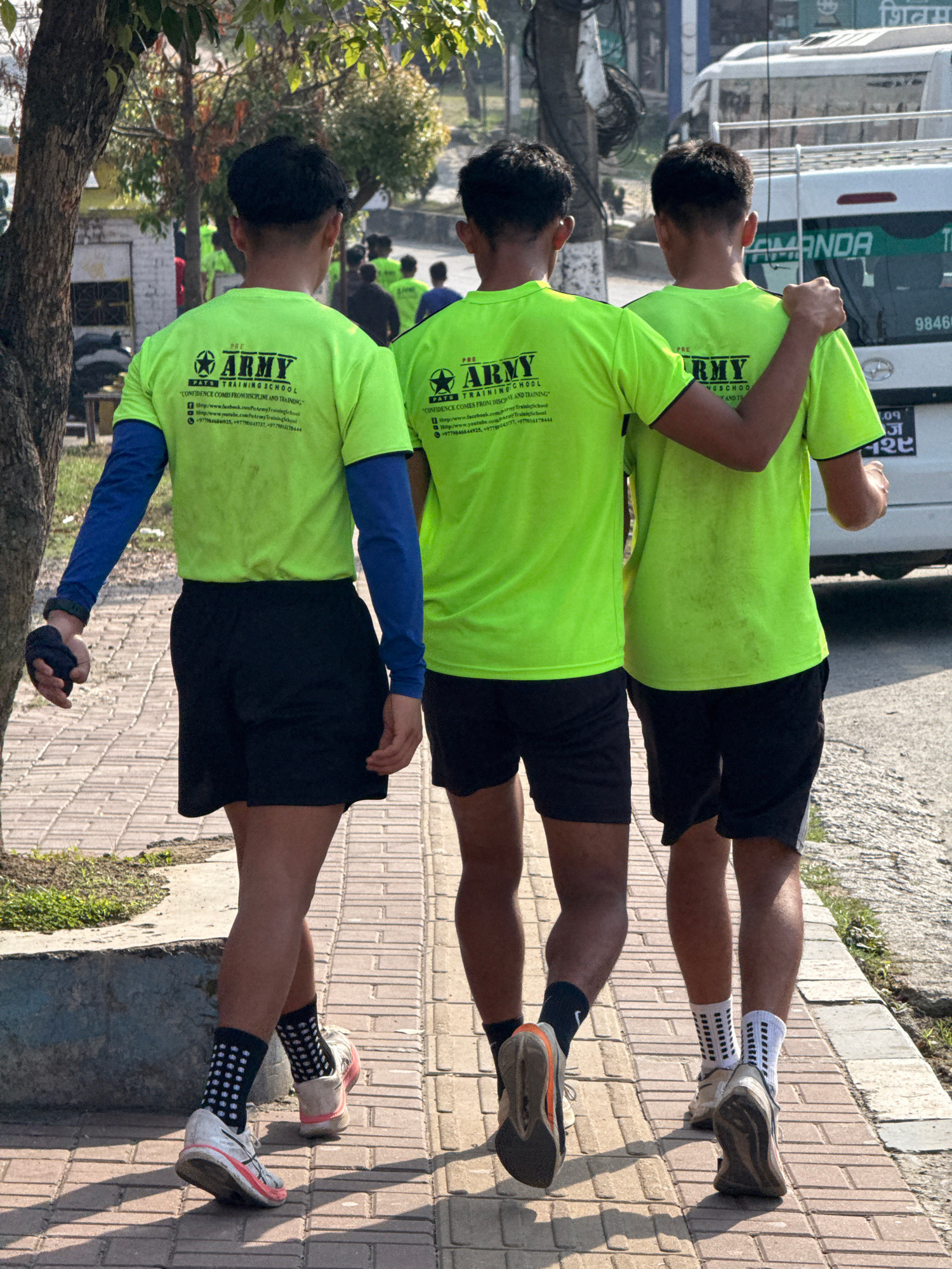 The image shows three men in neon yellow "Army Training School" t-shirts and black shorts running or jogging on a brick-paved path beside a road, likely in Nepal. One man wears blue long sleeves underβ¦read more