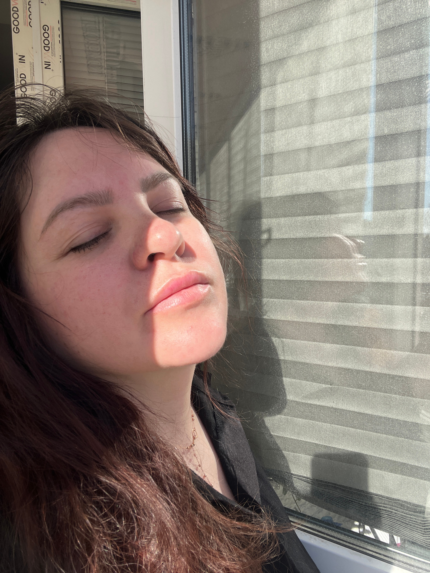 A fair-skinned woman with closed eyes and auburn hair rests near a window with closed blinds, likely in an indoor setting. Part of her face is brightly illuminated, while the rest of her head is in sh…read more