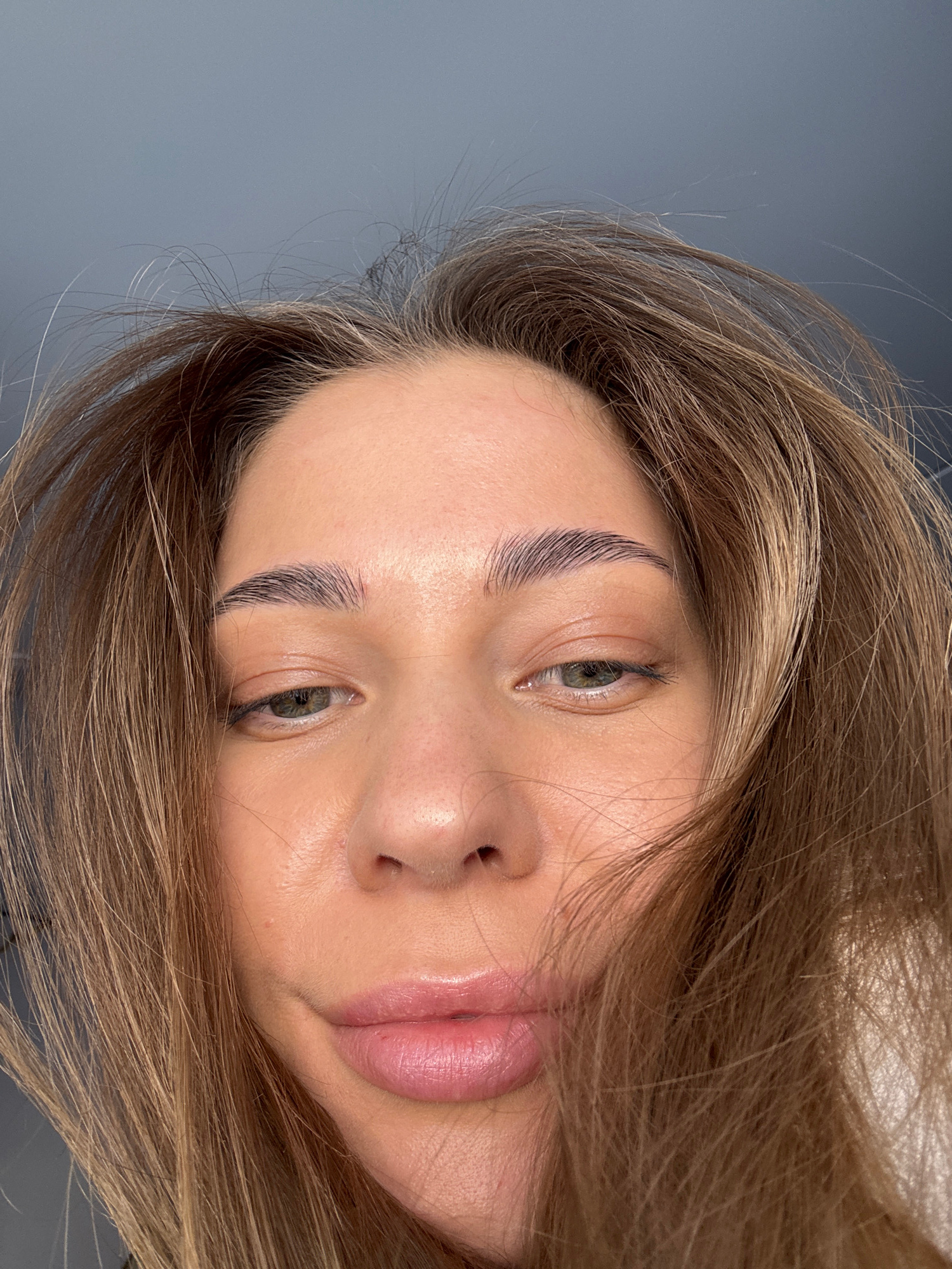 A close-up, slightly angled portrait shows a woman's face. The woman has light brown hair with highlights, green eyes, and full, glossy lips. Her eyebrows appear to be recently groomed or tinted. The…read more
