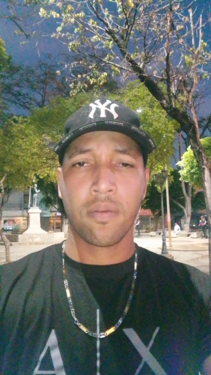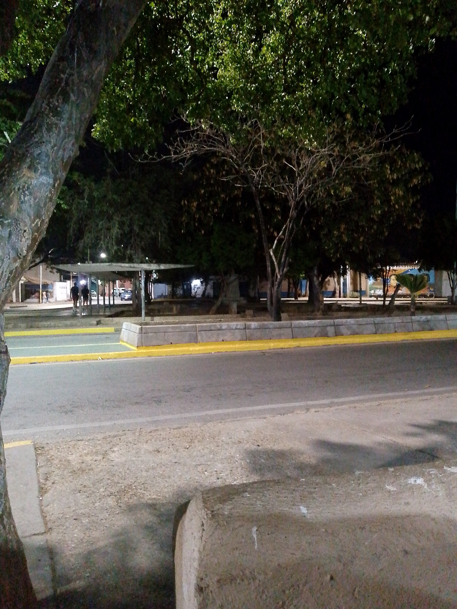 The image depicts a street scene at night in Juan Griego, Venezuela. A large tree trunk dominates the left foreground. Behind it, a road with a yellow line dividing it from a pedestrian area is visibl…read more