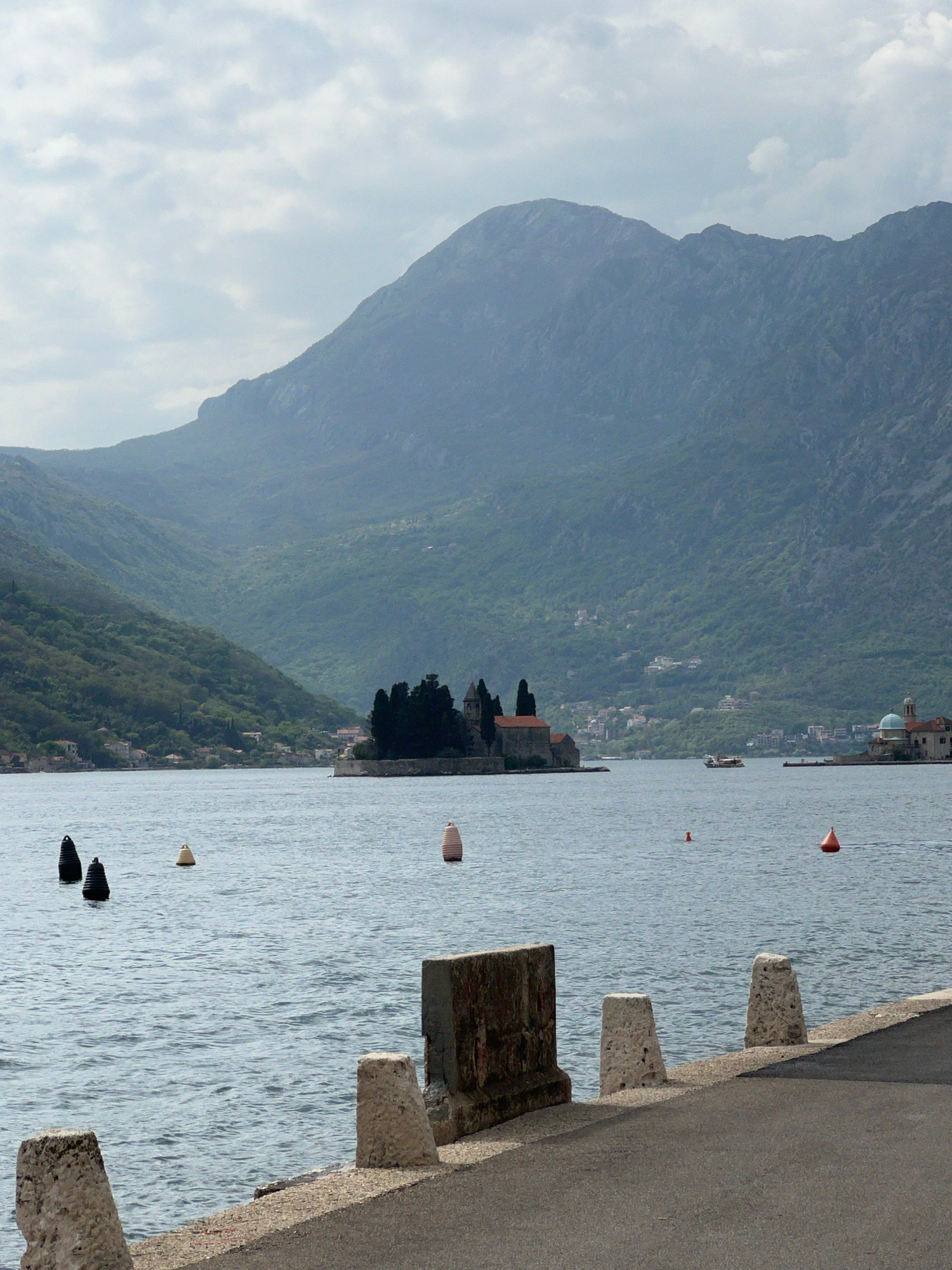 The image displays a tranquil coastal landscape, likely a bay, dominated by a formidable mountain range on the left, thickly carpeted with green vegetation that gradually loses definition in a hazy bl…read more