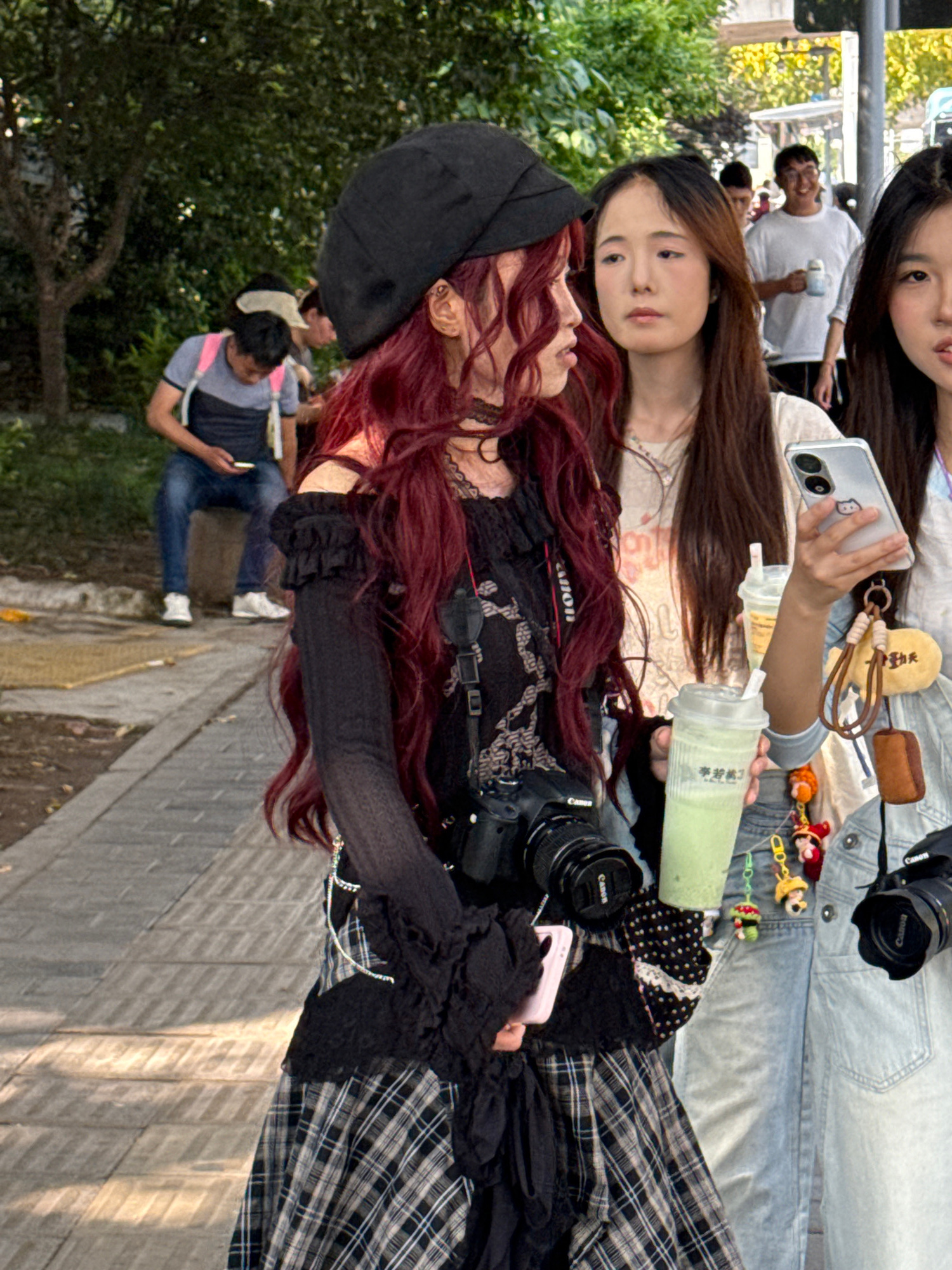This image depicts a casual outdoor scene in Nan'an District, China, under bright, clear daylight conditions. The foreground features three young women. One woman with long dark brown hair wears a li…read more