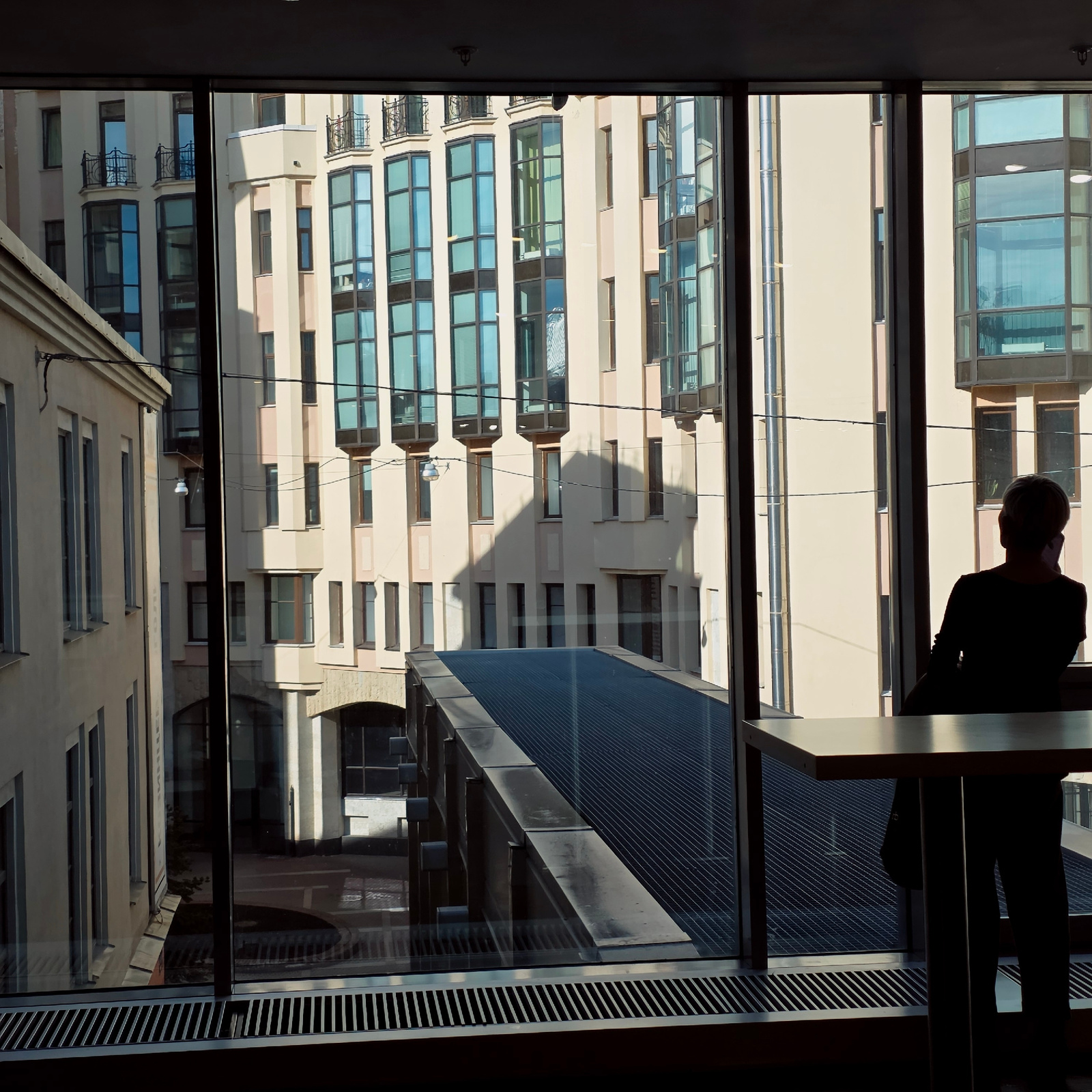 The image captures an urban scene viewed through a large window from an indoor vantage point, likely an upper floor. In the upper right quadrant, a person is silhouetted against the bright exterior, l…read more