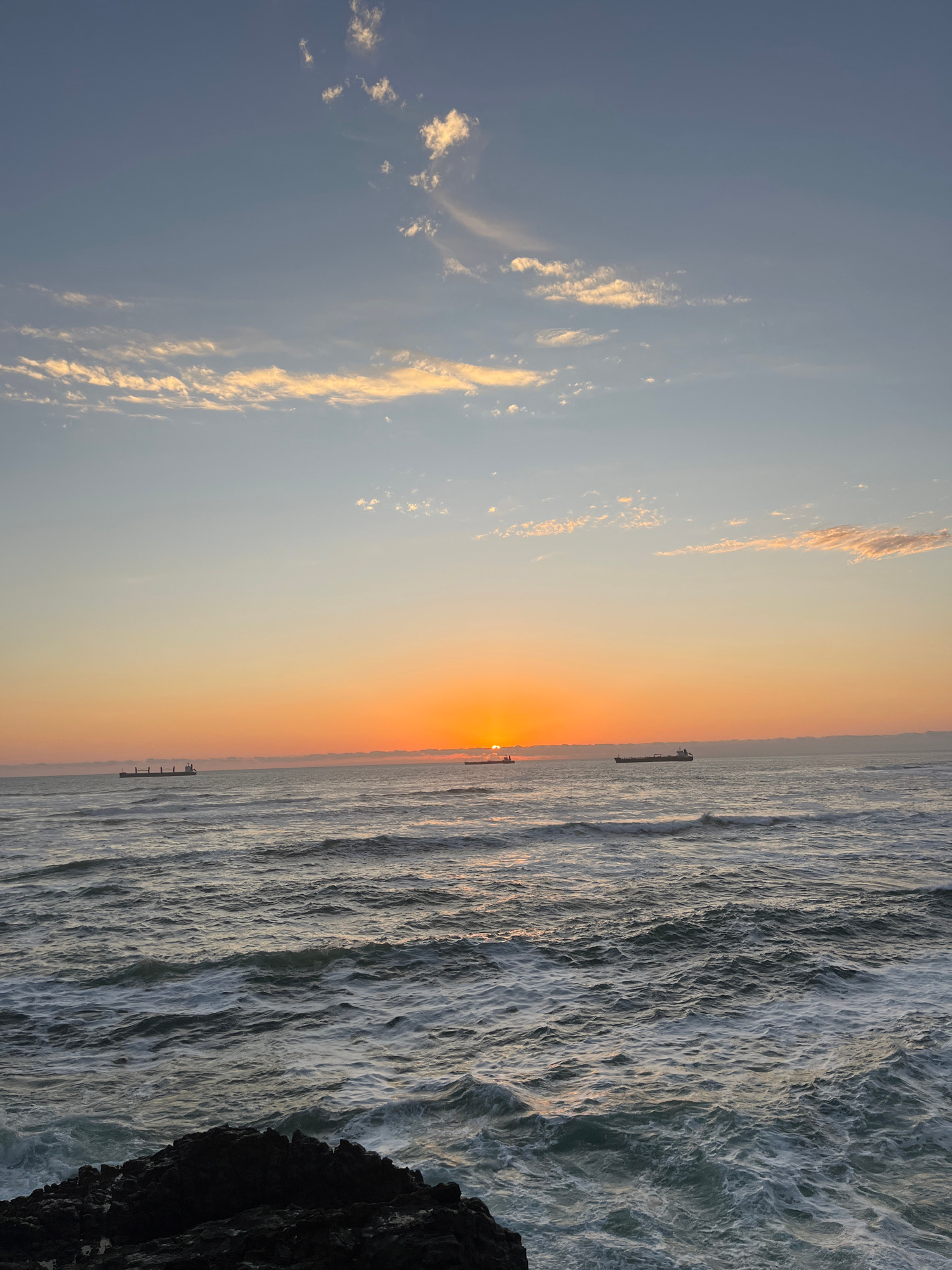 The image captures a sunset over the ocean in Arica, Chile. The sky transitions from blue with scattered clouds to a gradient of yellow and orange near the horizon where the sun is setting. Two ships…read more