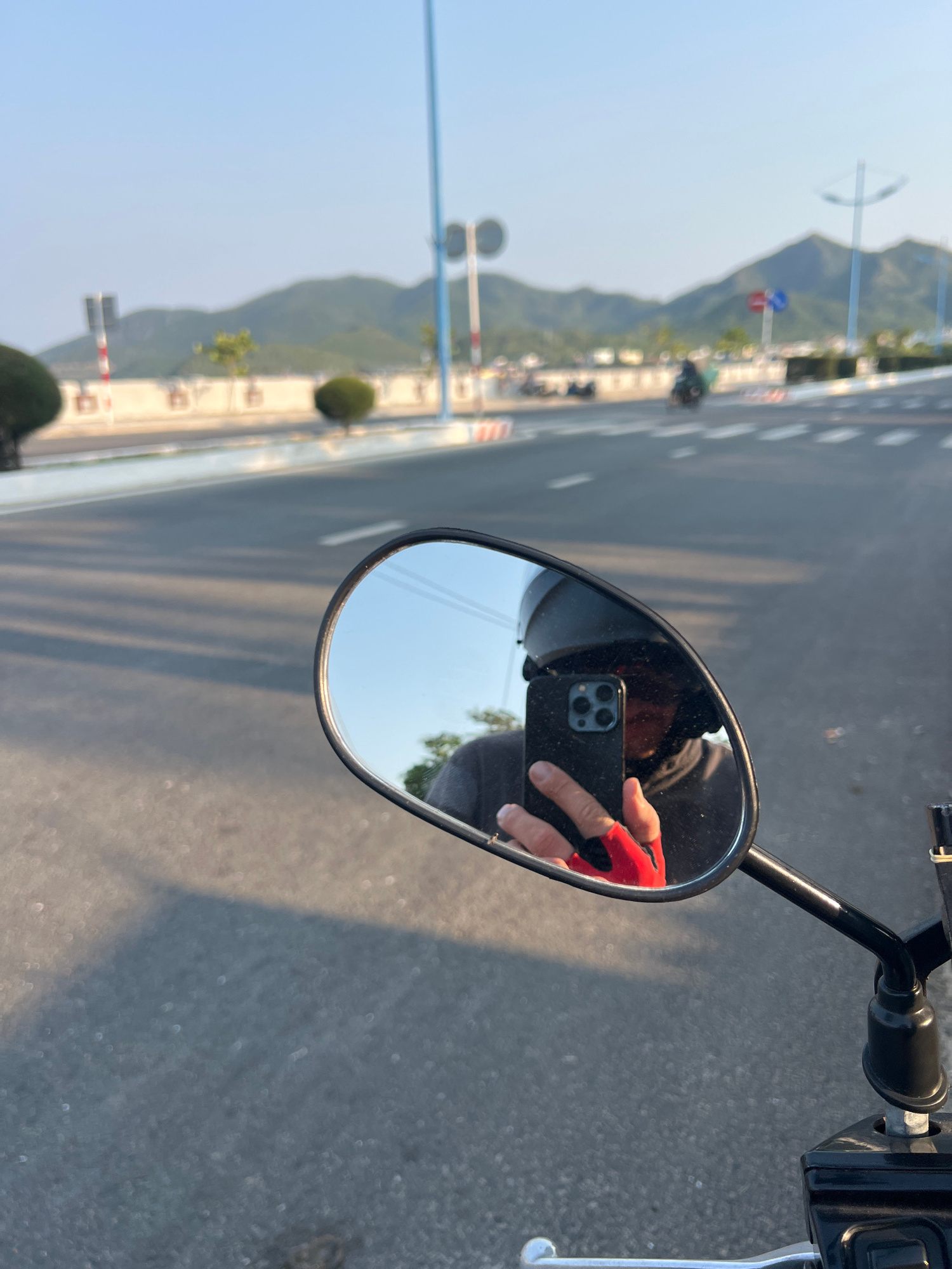 The image shows a motorcycle side mirror reflecting a person holding a smartphone. The person is wearing a red glove on the hand holding the phone. The background visible in the mirror shows a road an…read more