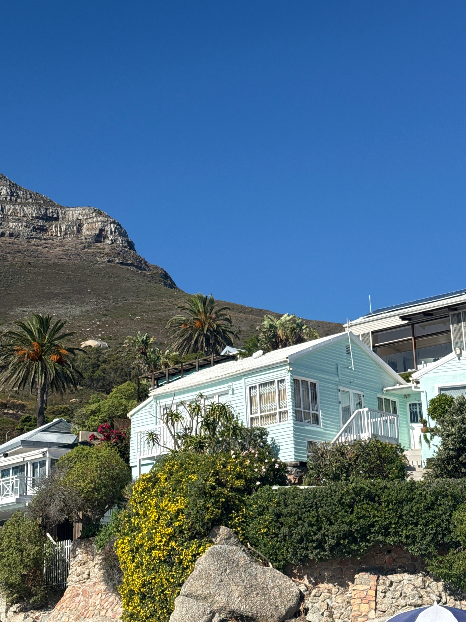 The image presents a seaside scene in Cape Town, South Africa, featuring a light blue multi-story house nestled amidst lush vegetation and a rocky terrain, with Table Mountain forming a dramatic backd…read more