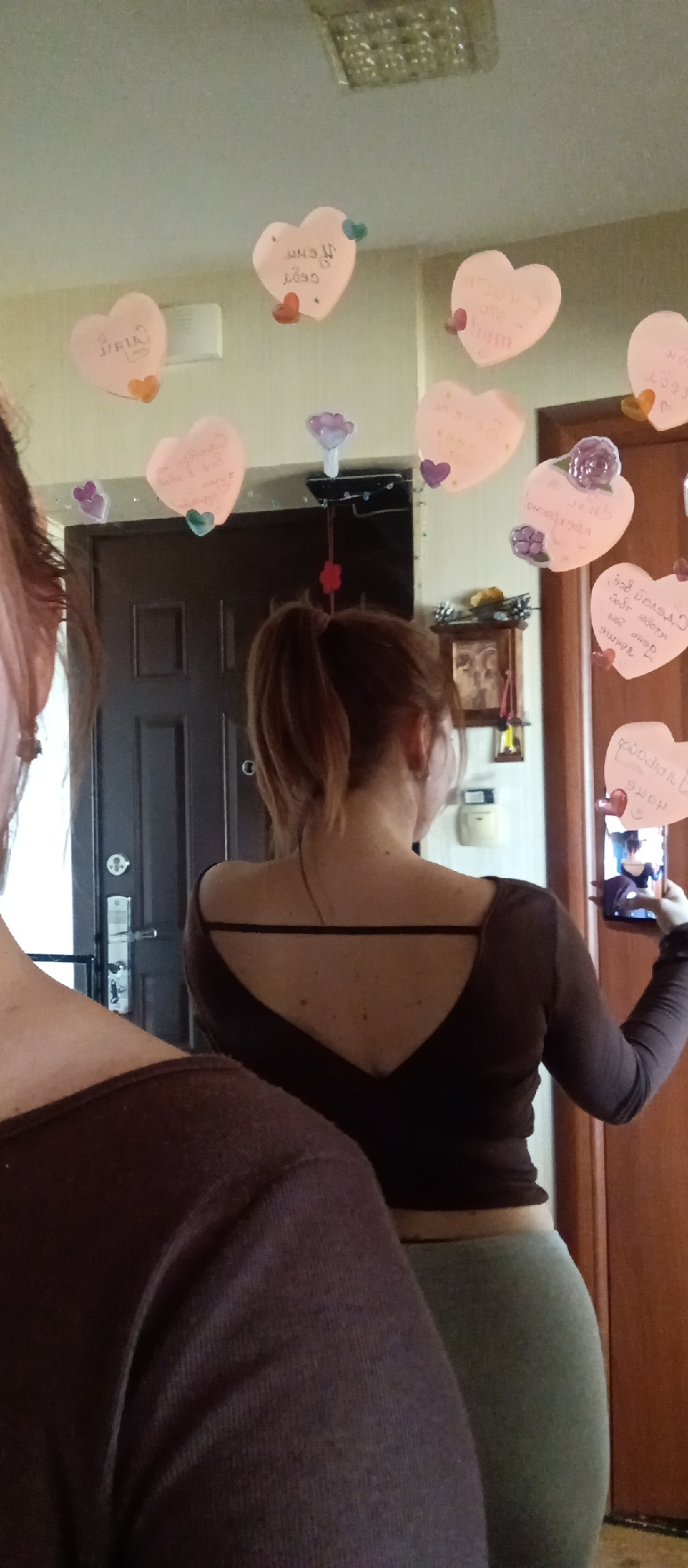Two women are seen from behind in an indoor setting, likely a home, decorated with numerous heart-shaped notes. In the mid-ground, a woman with reddish-brown hair styled in a ponytail is wearing a dar…read more
