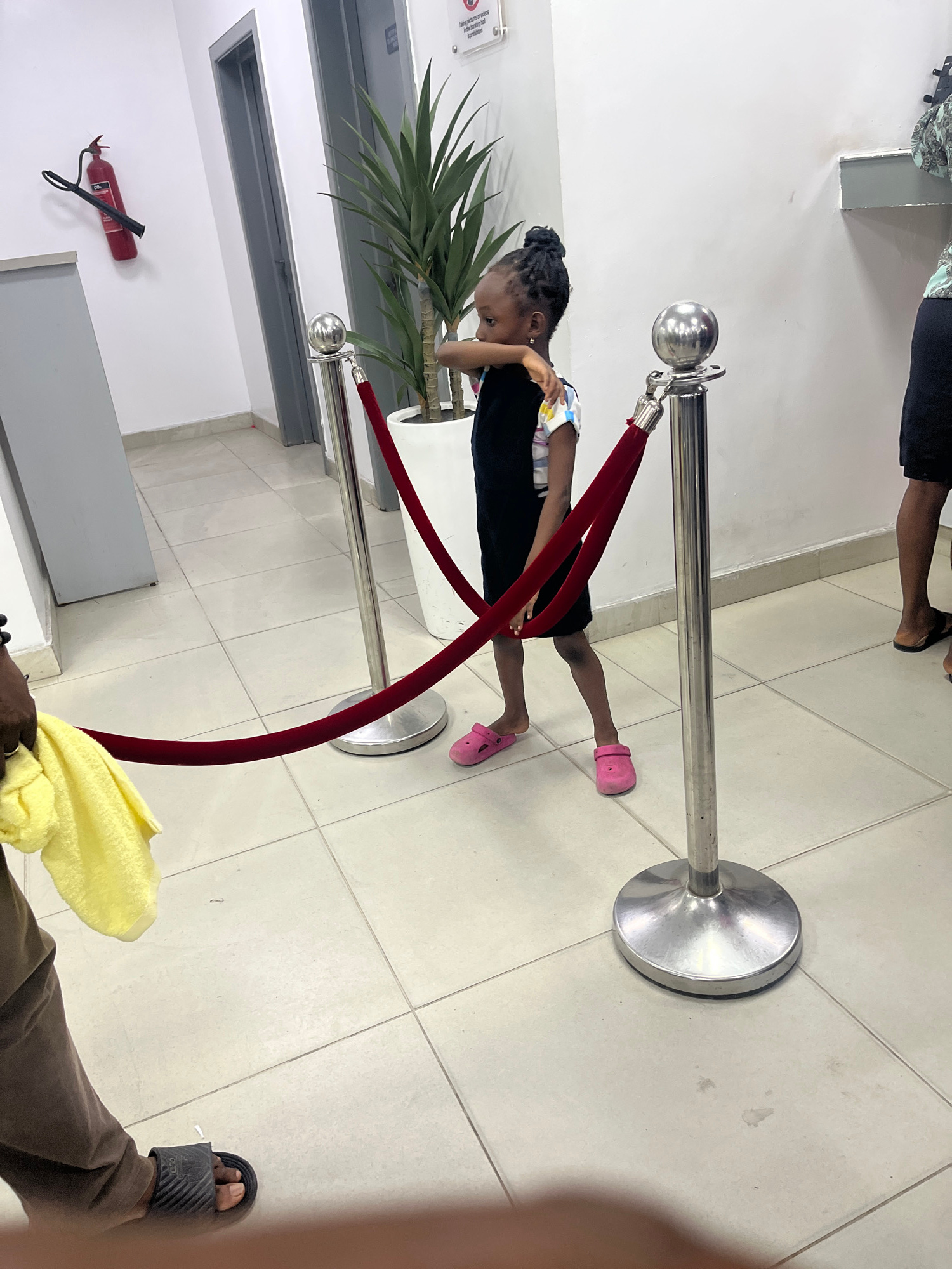 A young girl with dark hair braided on top of her head is lying on her stomach, face down, under a red velvet rope attached to two chrome stanchions in Ado, Nigeria. She is wearing a black dress withβ¦read more
