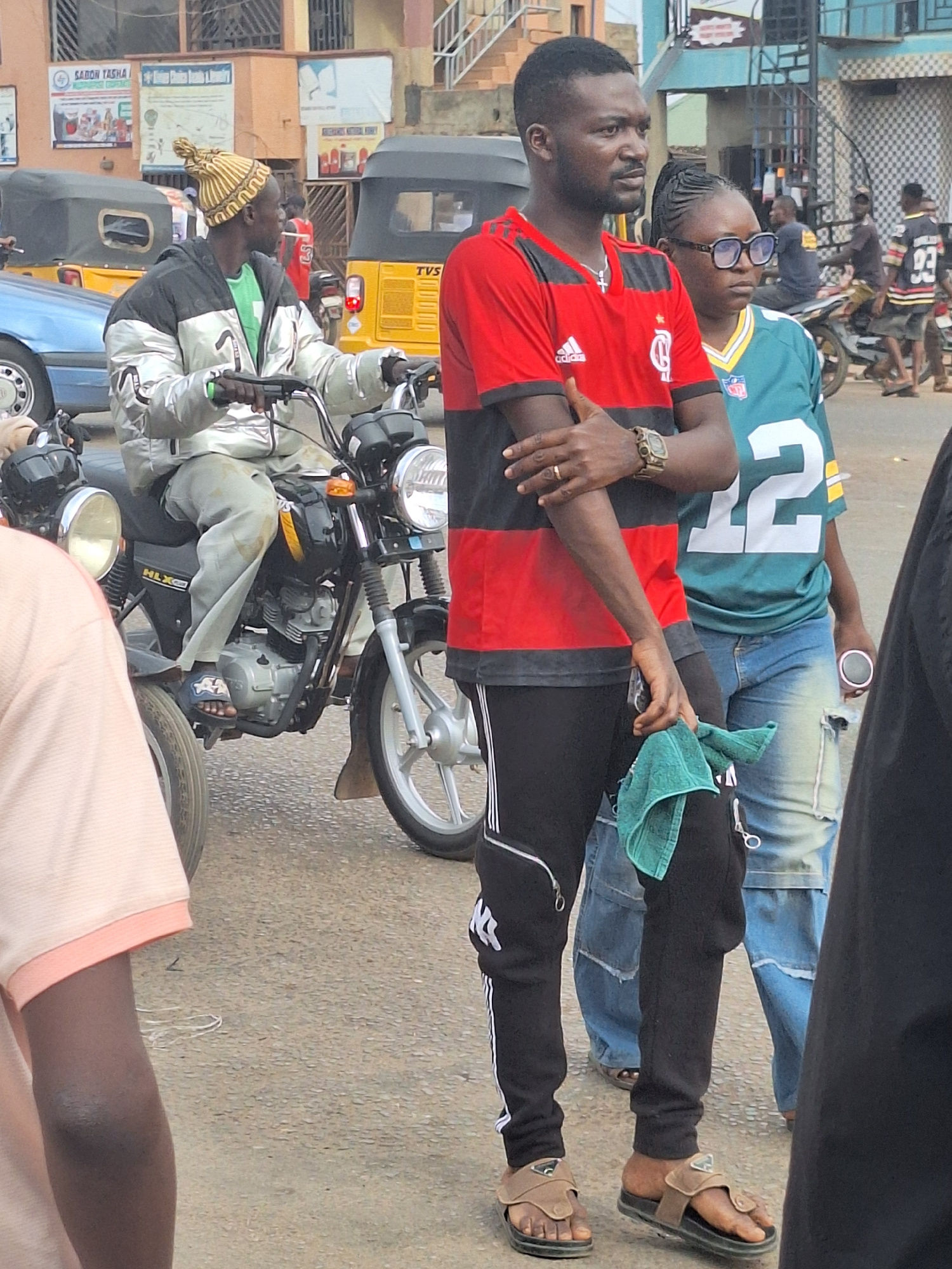In Sabon Tasha, Nigeria, a man wearing a red and black Adidas shirt and black Adidas track pants with white stripes is standing on the sidewalk next to a motorcycle. He is wearing brown sandals and a…read more