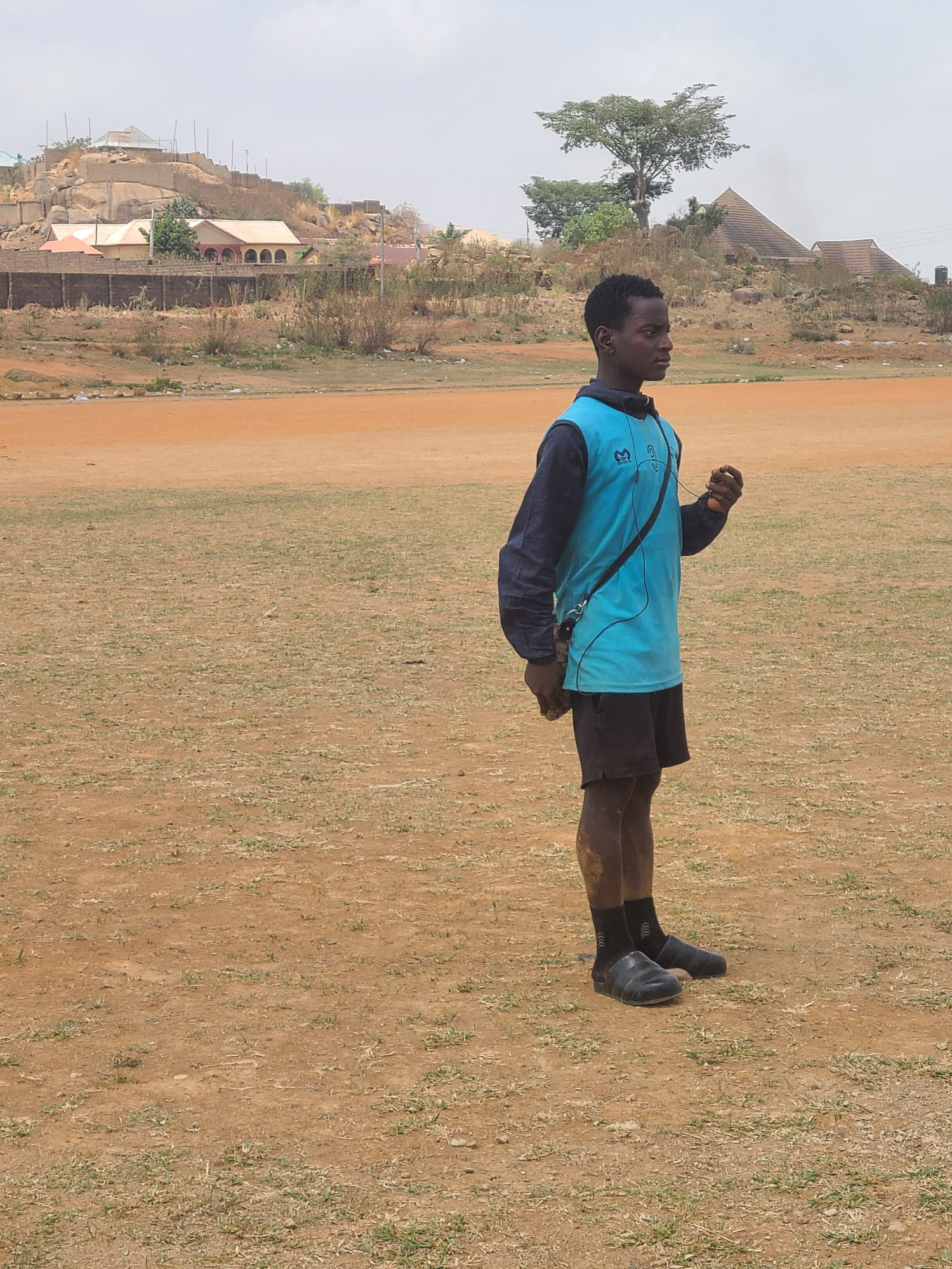 A medium shot captures a young Black man standing in a field in Barikin Jirga Summa, Nigeria. He faces left, dressed in a light blue vest over a dark blue shirt and dark shorts. He wears dark socks an…read more