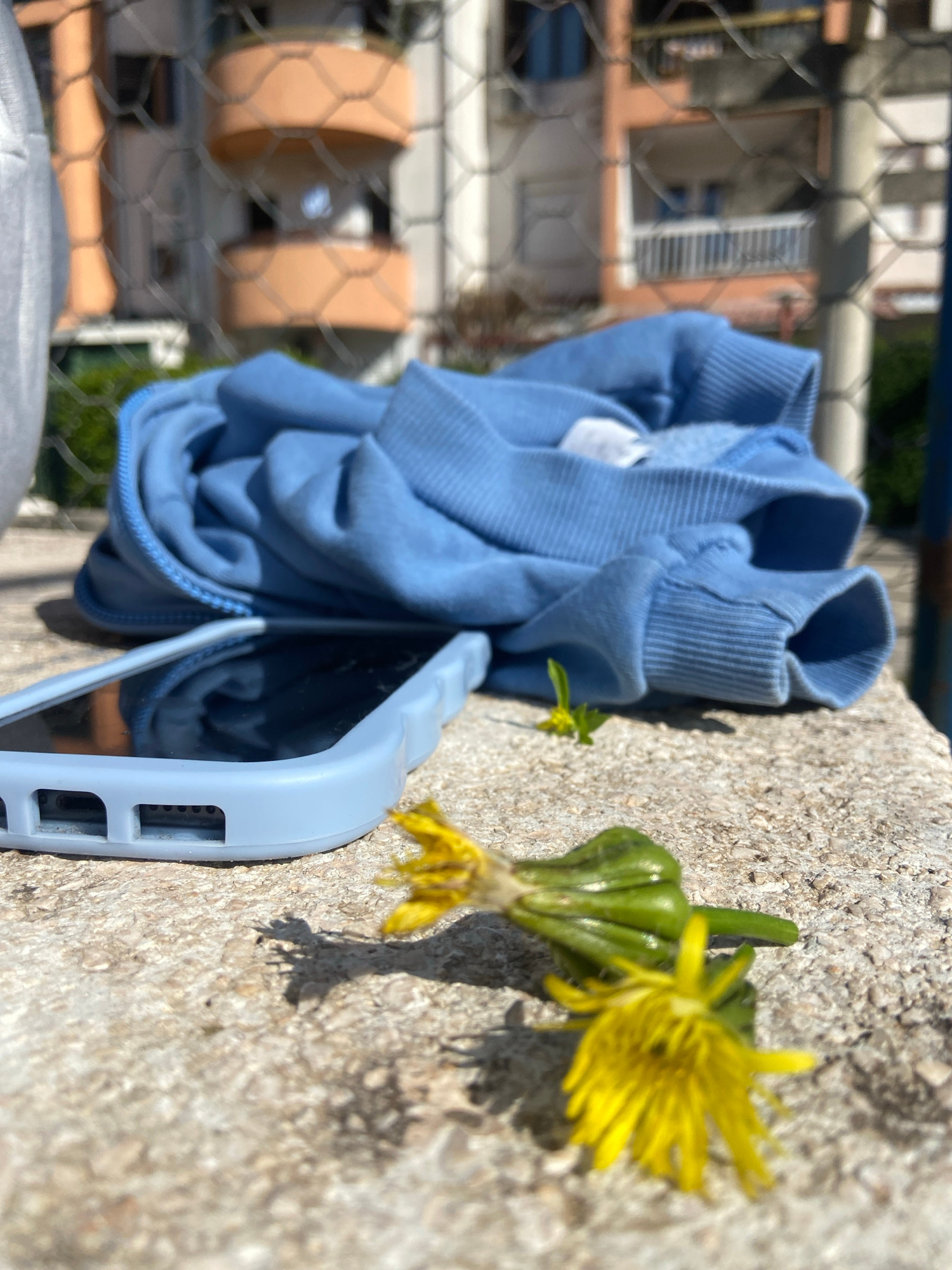 On a weathered concrete surface, a light blue hoodie and a phone in a matching light blue case are positioned next to a yellow dandelion. The hoodie is bunched up, obscuring the phone’s screen. The ba…read more