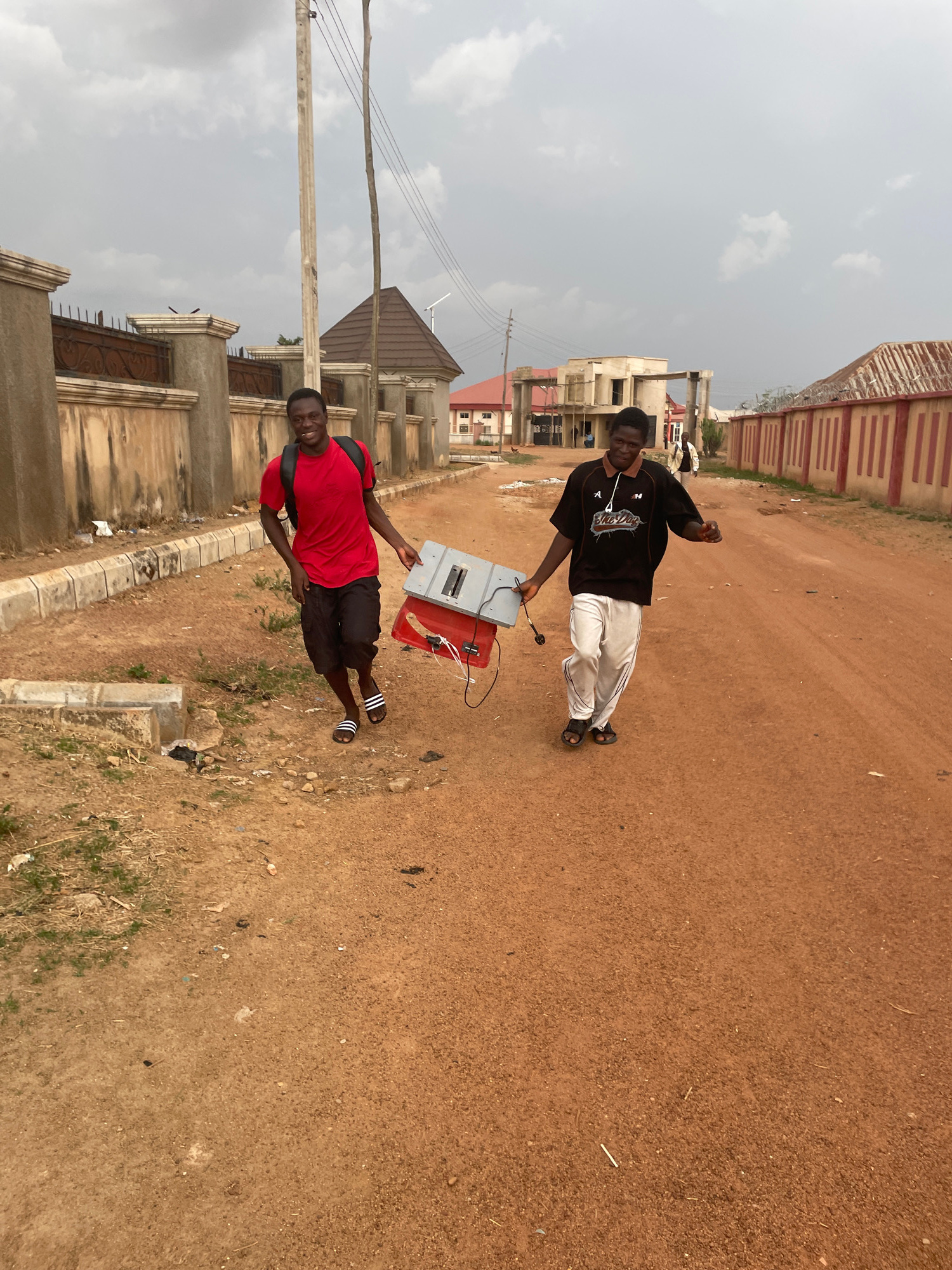 Two young men stand on a dusty, red-brown dirt road, possibly in Jos, Nigeria, based on the architectural style of the surrounding buildings. One man wears a black t-shirt with white lettering and lig…read more