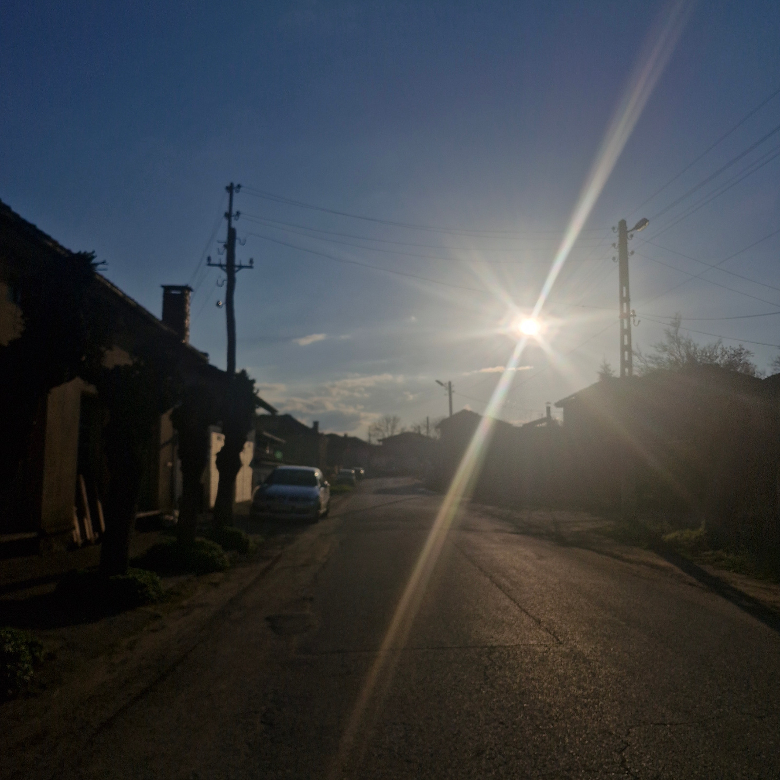 The image captures a street scene in Hirevo, Bulgaria, oriented vertically. The sun shines intensely in the upper-left quadrant, casting a bright flare across the sky and down the street. Overhead pow…read more
