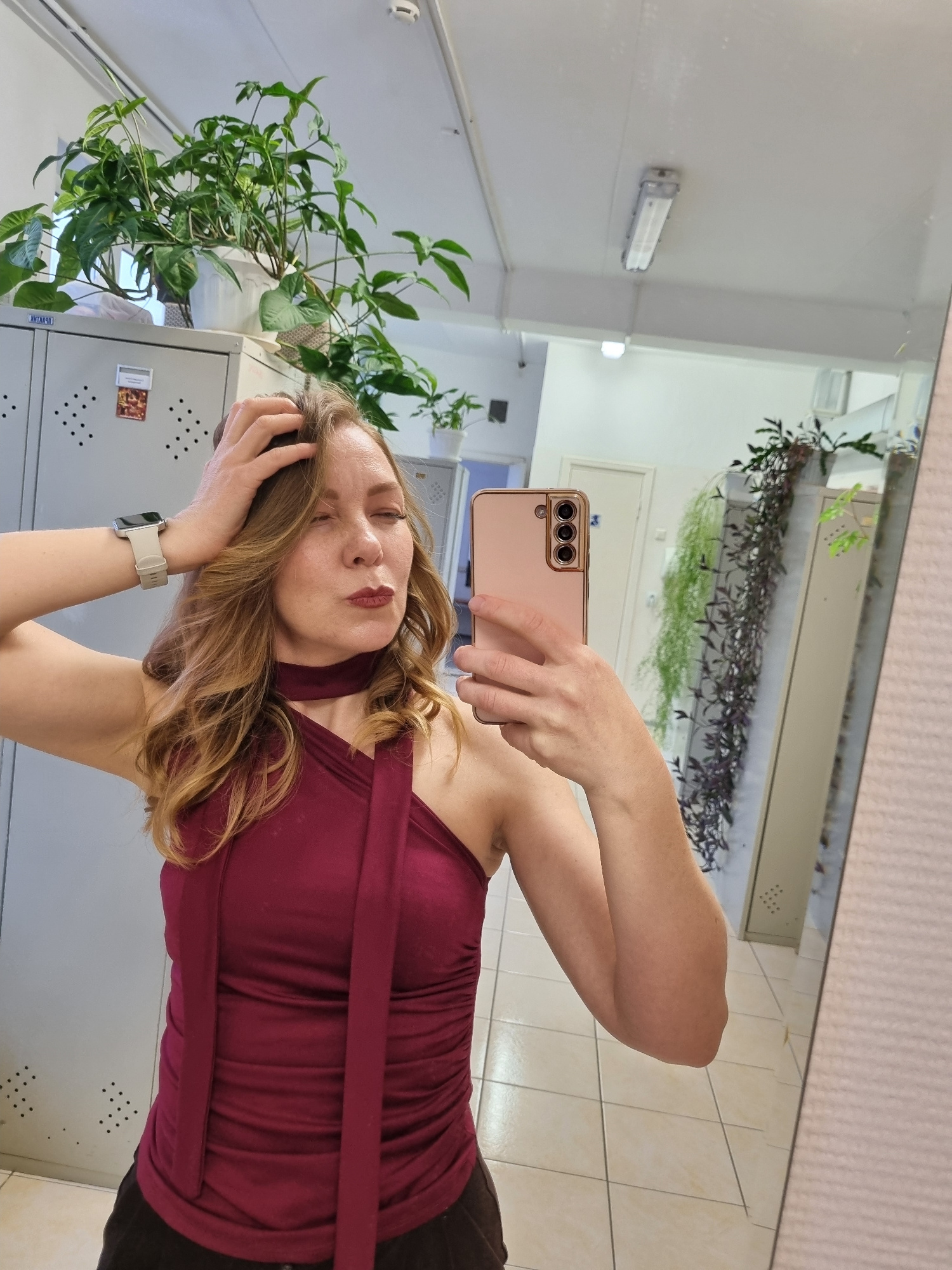 The image shows a woman in a maroon top with long ties, taking a selfie in what appears to be a locker room. She is holding a rose-gold colored smartphone in her right hand, with her left hand touchin…read more