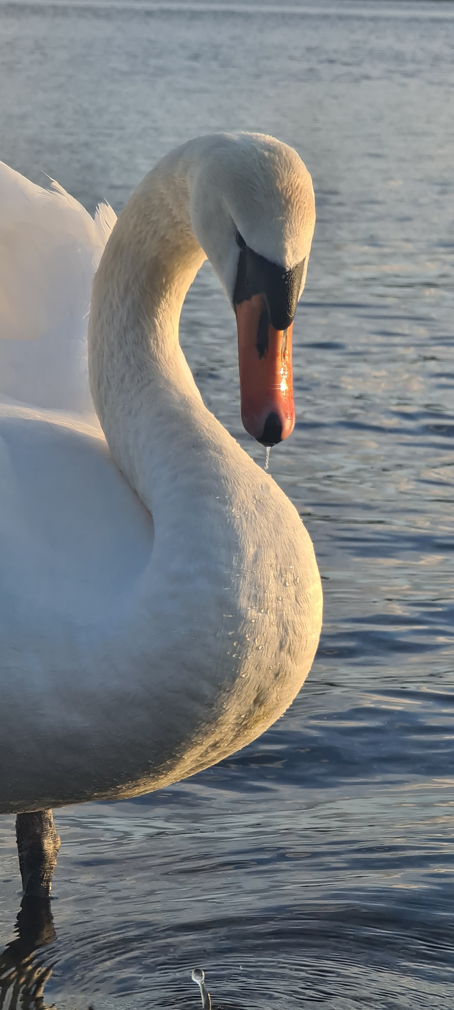 A close-up of a white swan bending its neck to preen. The swan has an orange beak with a black tip. Water droplets cling to its white feathers. The background shows rippled water reflecting light. The…read more