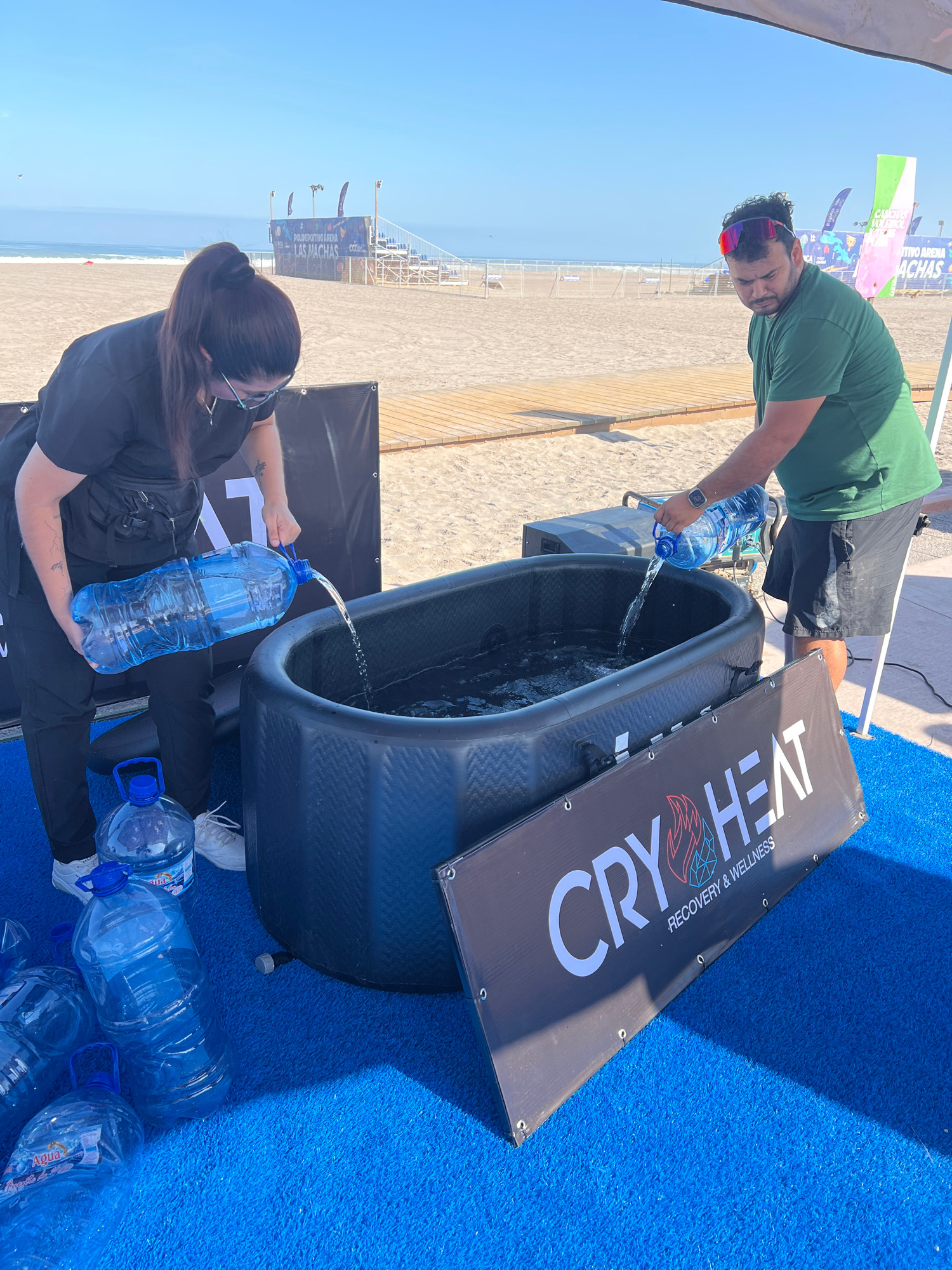 This image shows two people pouring water into a container labeled "CRYOTHERAPY & WELLNESS". The location is the beach, in the city of Arica, Chile, indicated by the "POLIDEPORTIVO ARENA LAS MACHAS" s…read more